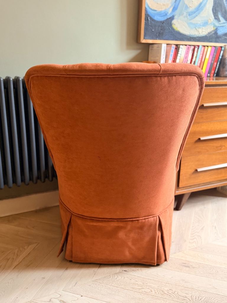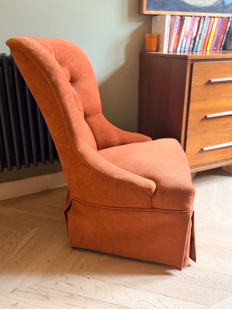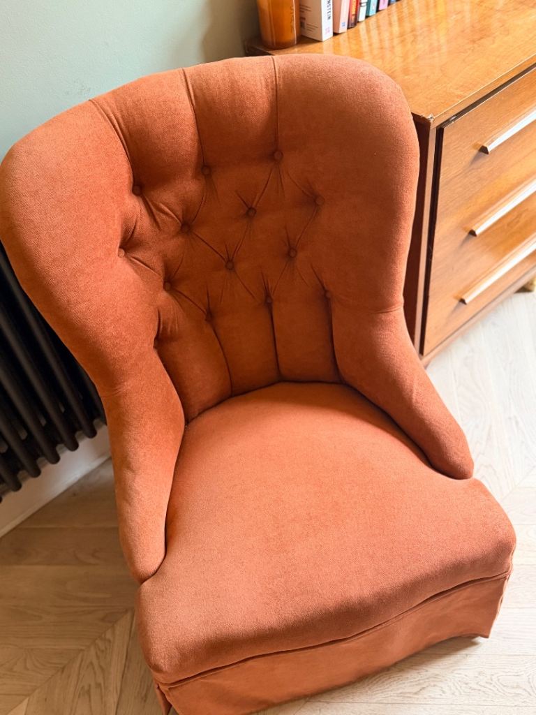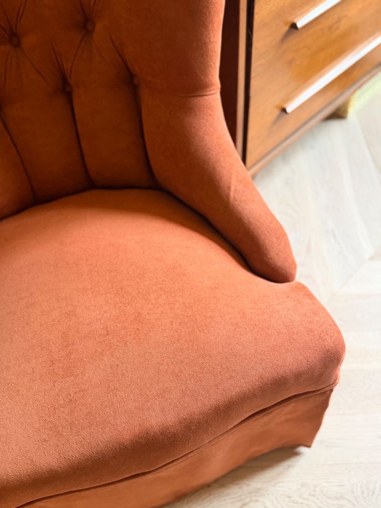 Gorgeous coral upholstered bedroom chair.