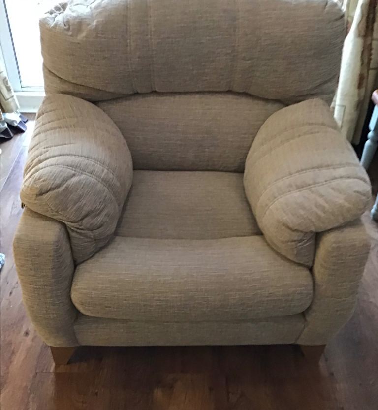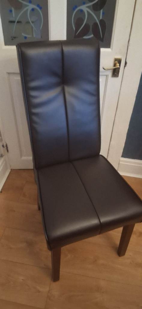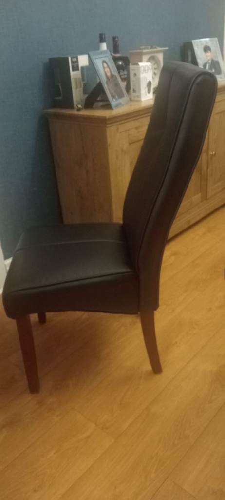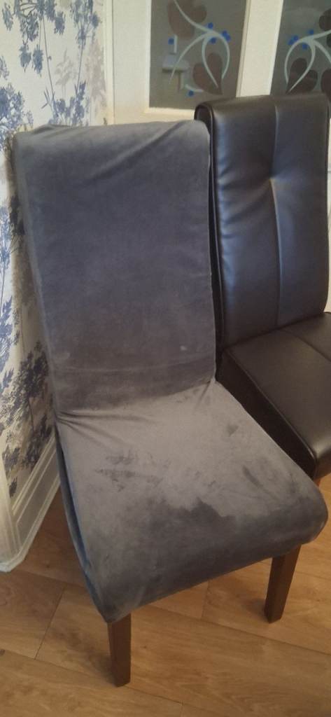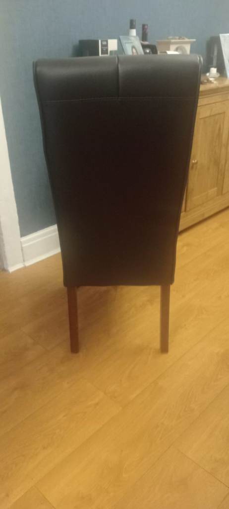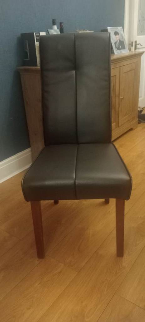 4 lovely Dining Chairs, Brown easy to wipe over with or without grey covers.