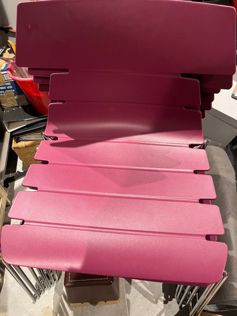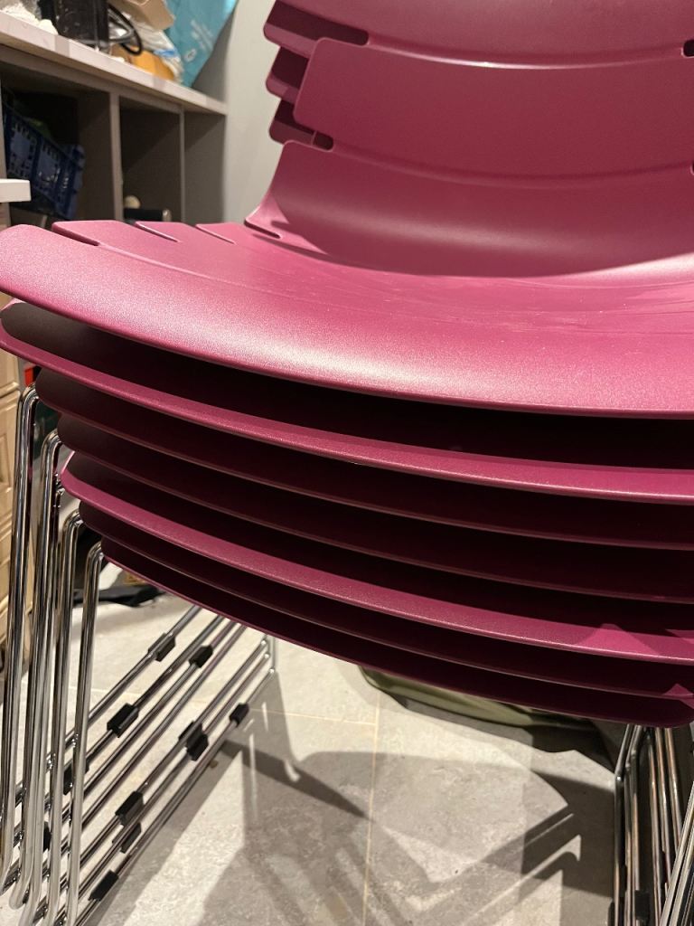 Burgundy, moulded plastic chairs with silver legs. Were used in a meeting room but also could be used for a modern dining room setting. Eight chairs in total.