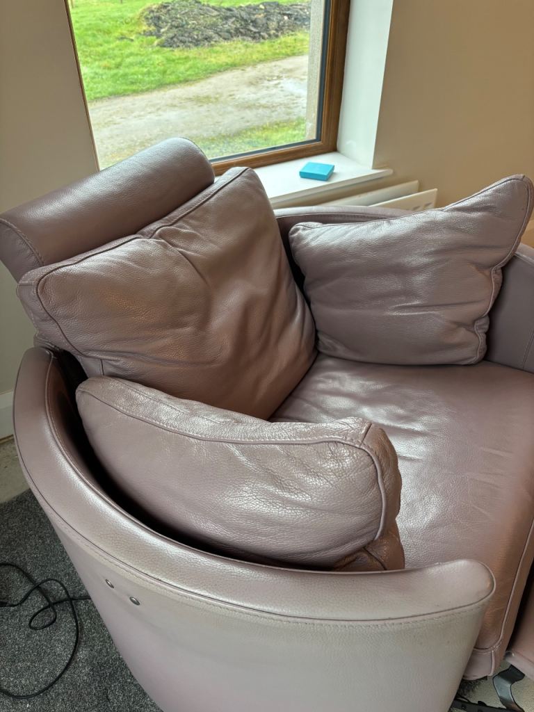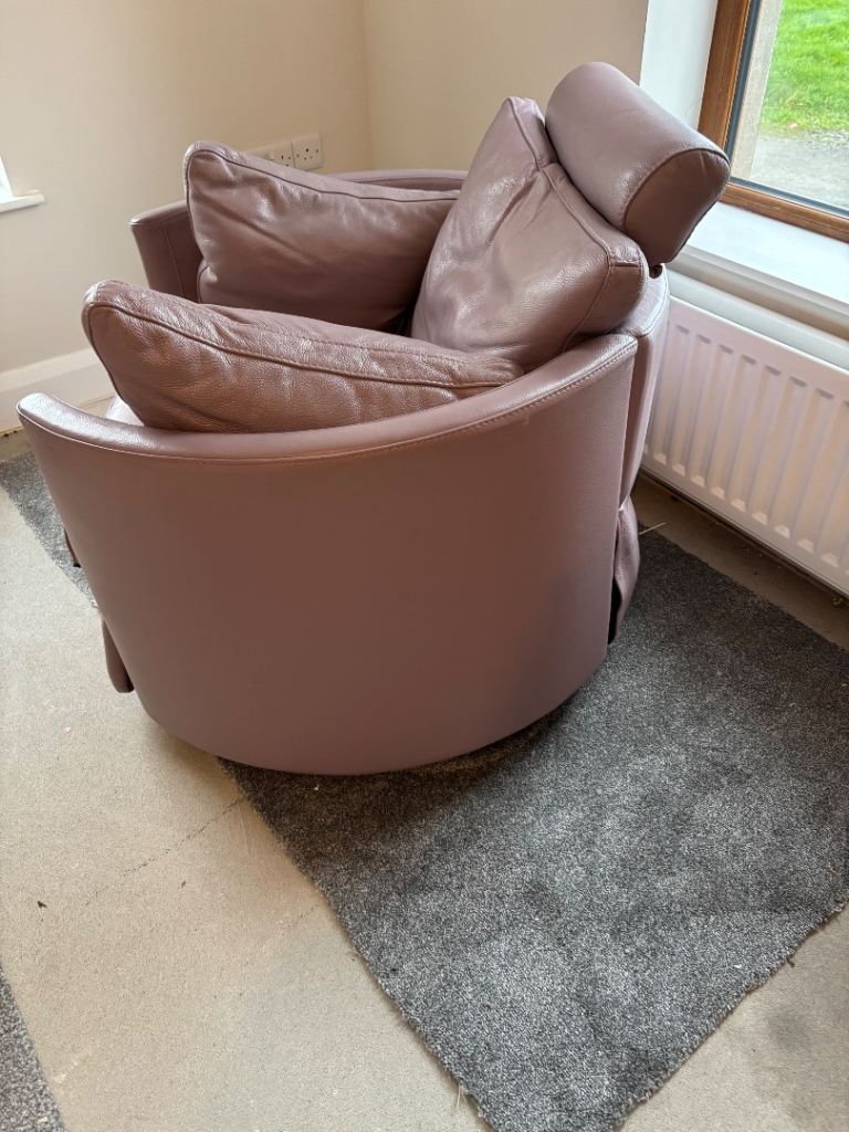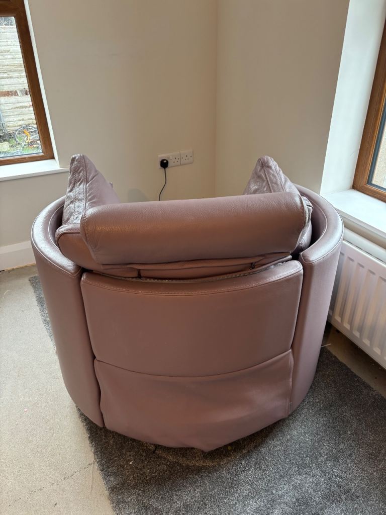 Lilac- Grey Italian Leather FAMA MOONCHAIR— famous for its reclining, rocking motion & swivel mechanism. A lovely therapeutic chair! A perfect chair for the nursery, living room or bedroom. No marks, cuts or tears.