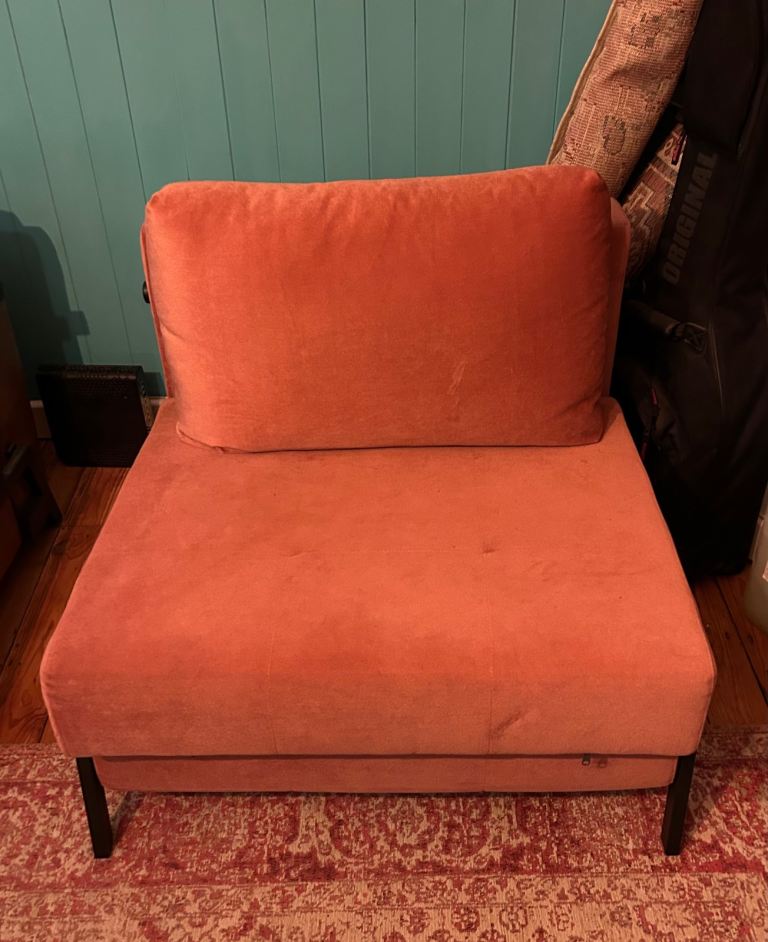 Really easy to transform from chair to bed, just fold out the seat, unzip the bottom to release the legs, and thats pretty much it. Only been used a few times as I overestimated how many people would be staying overnight when we already have a spare room. I’ve also got a single mattress topper that hooks round the ends for extra comfort.