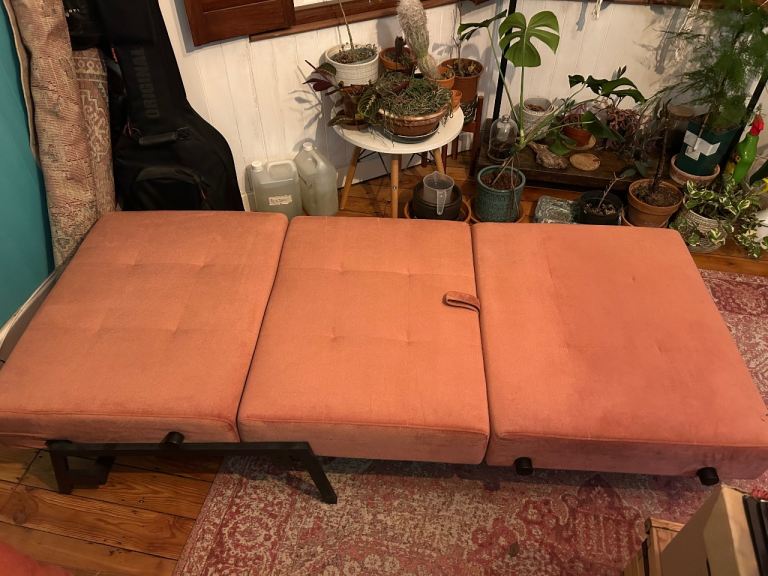 Pink fabric chair bed. As a chair the dimensions are 80cm x 85cm and as a bed its 80cm x 187cm.