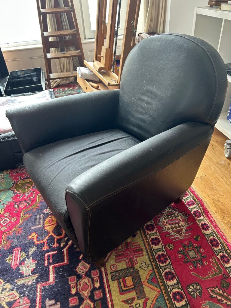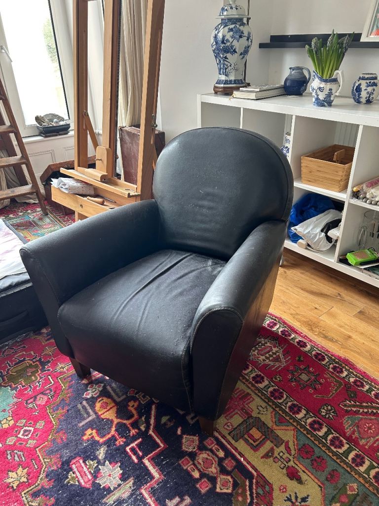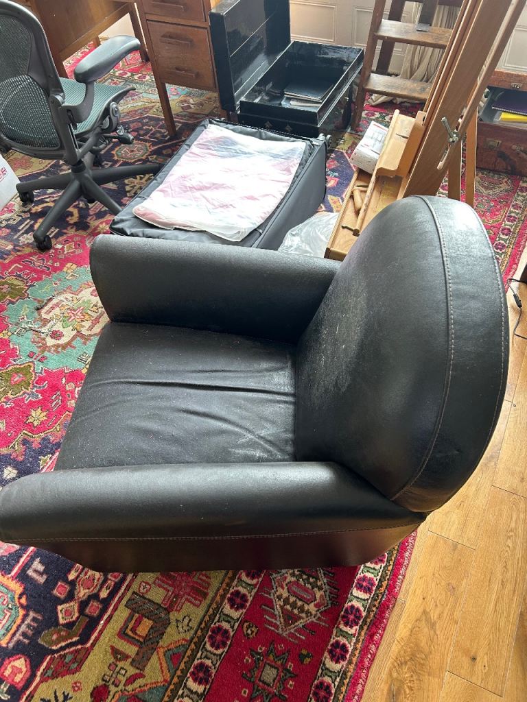 Black faux leather chair . Worn a little . Free. Comfy! Selling my place so collection asap if possible.