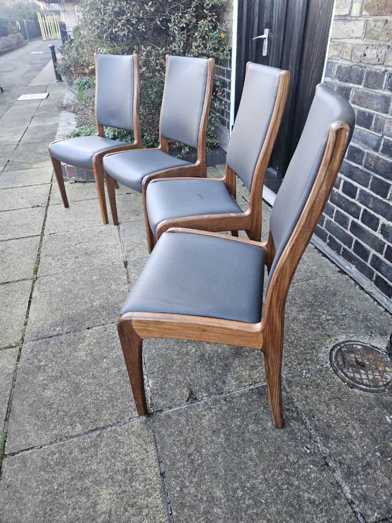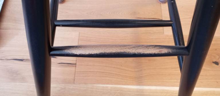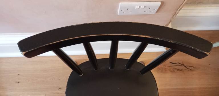 Used wooden chair in black, slightly wobbly but still perfectly functional. Shows signs of wear as per photos.