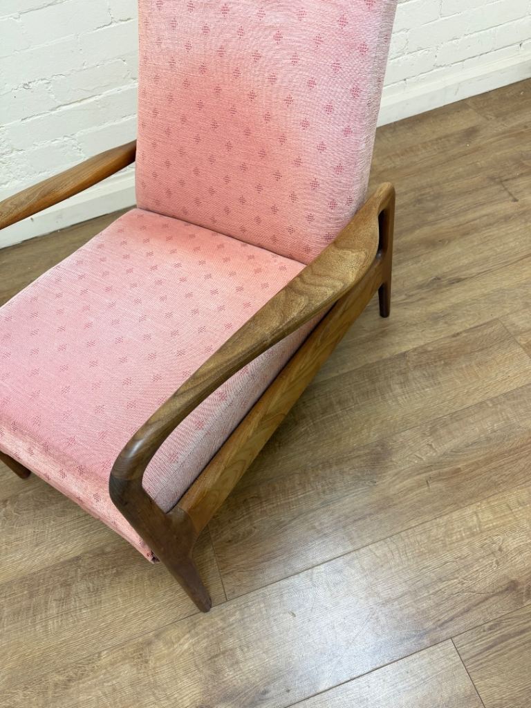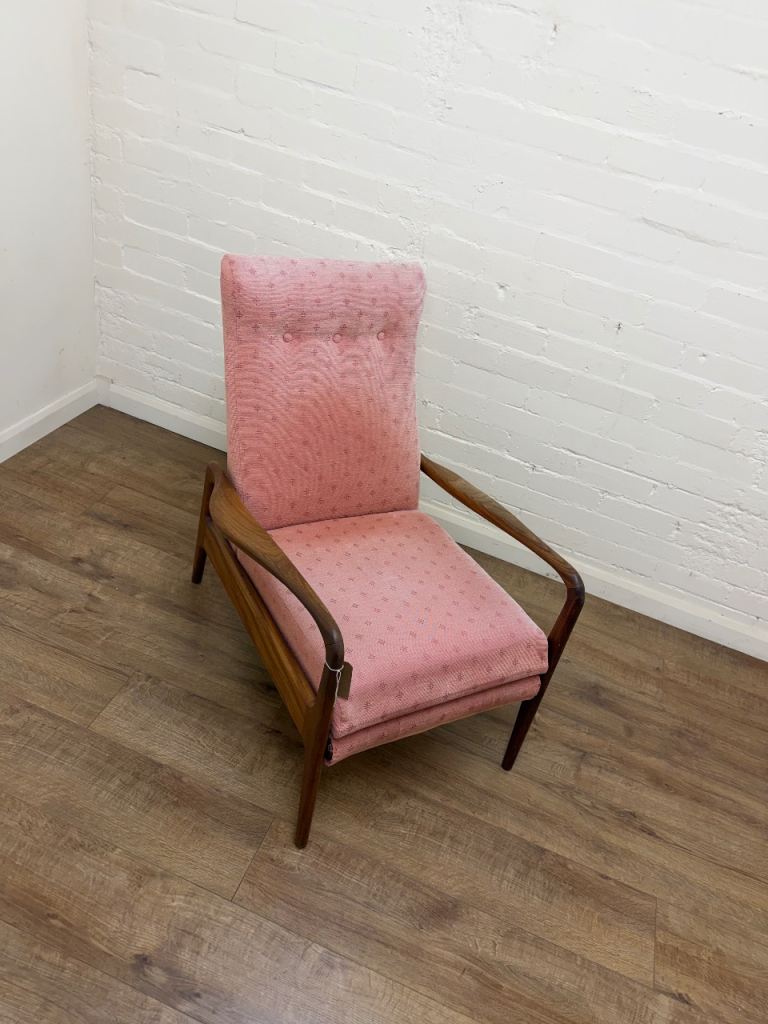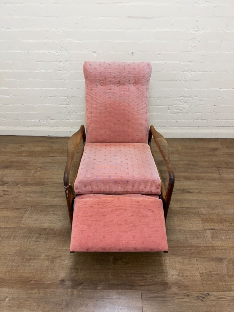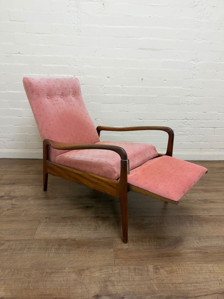Teak mid century reclining armchair by Greaves & Thomas. Lovely teak mid century frame. Manual reclining seat with pop up seat rest. Good solid frame. Lovely example!