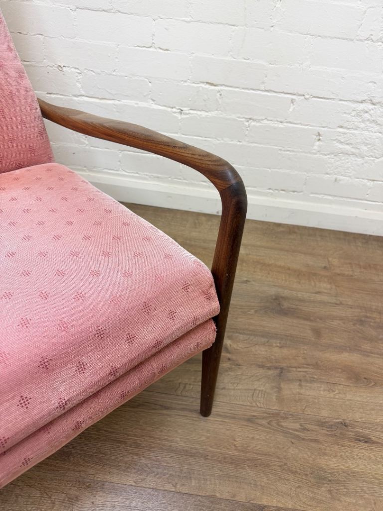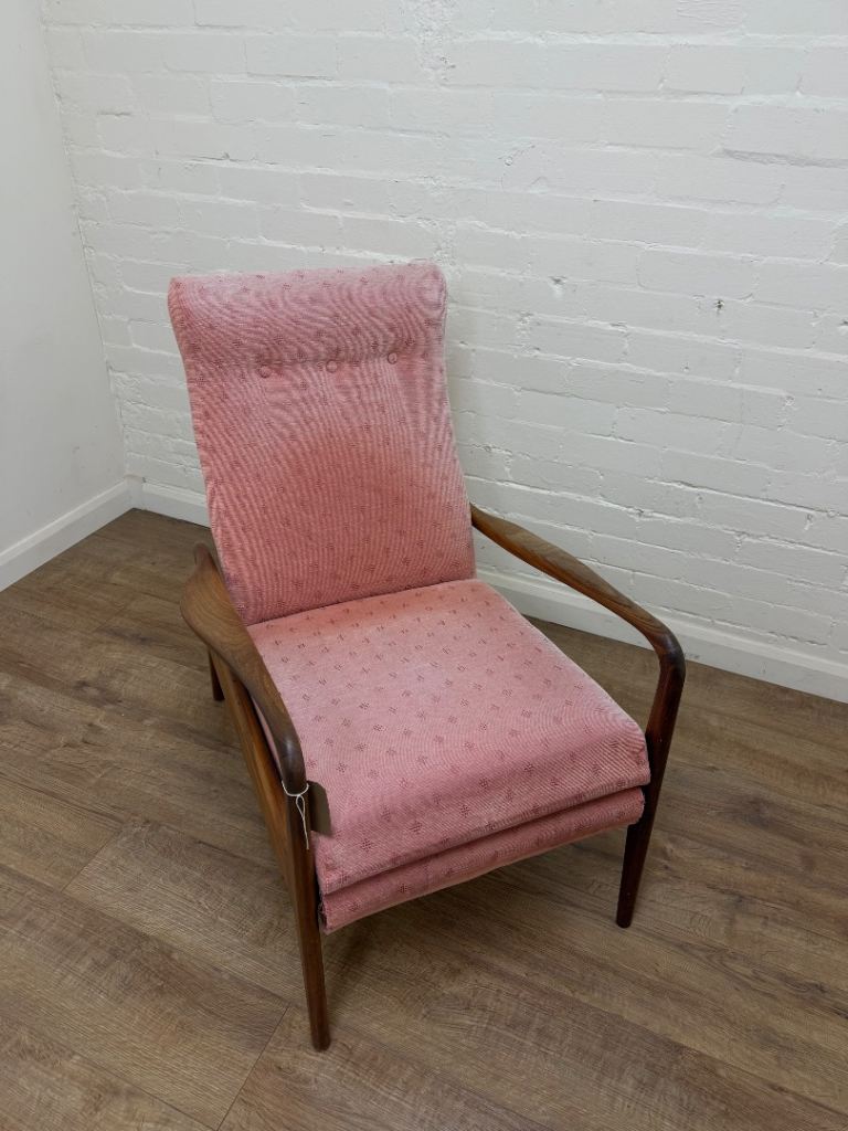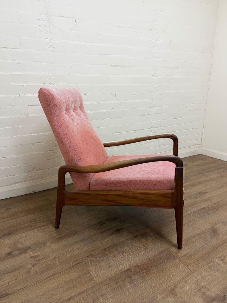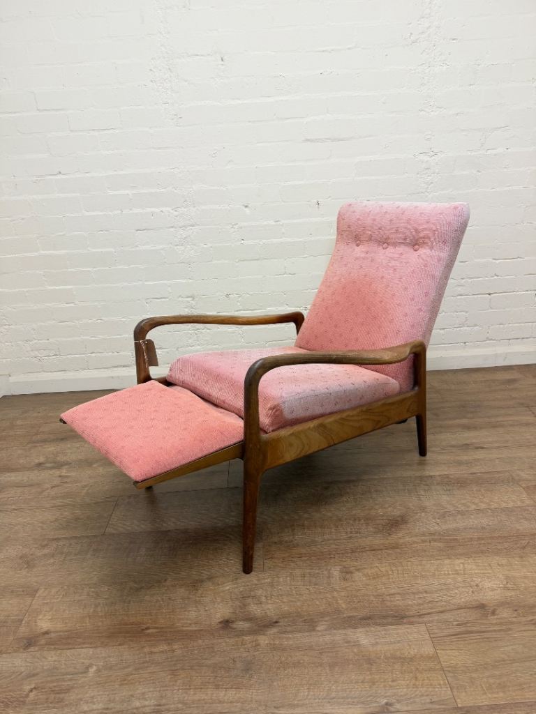 Teak mid century reclining armchair by Greaves & Thomas. Lovely teak mid century frame. Manual reclining seat with pop up seat rest. Good solid frame. Lovely example!