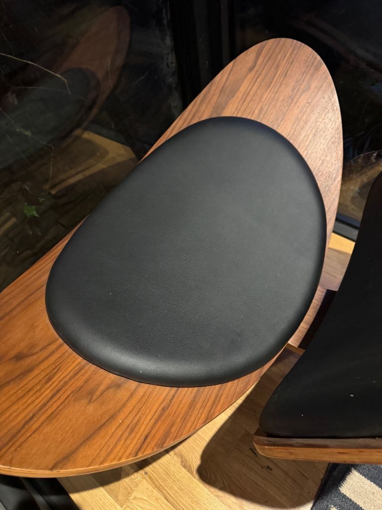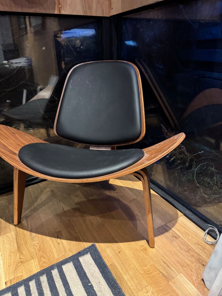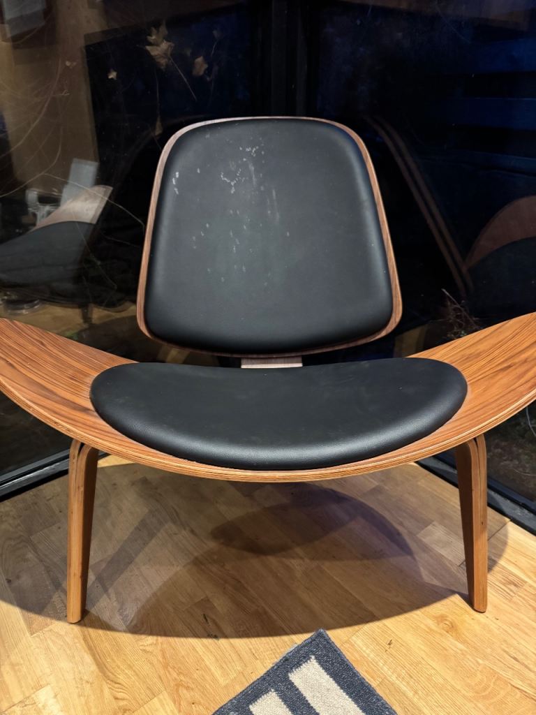 Black and walnut leatherette chair. The back cushion has some marks, but still a nice piece and priced to reflect this.
