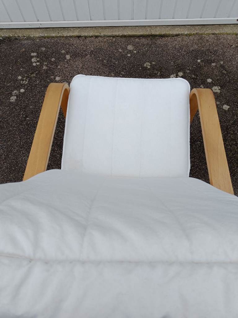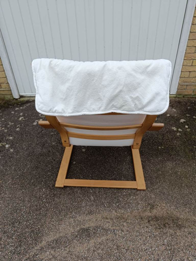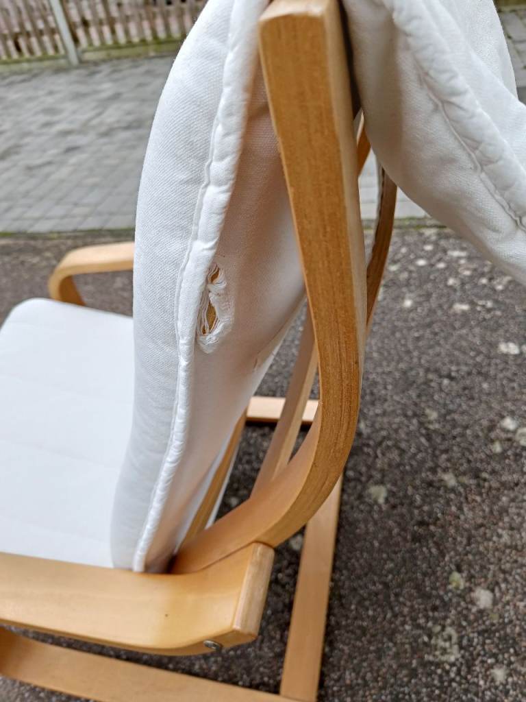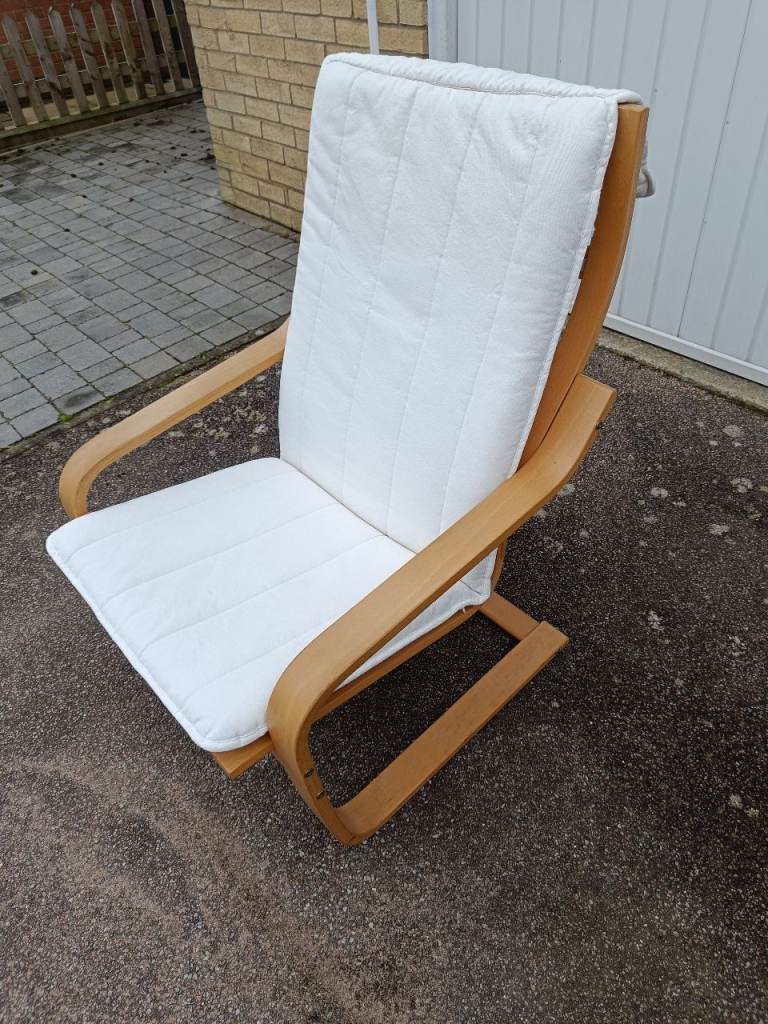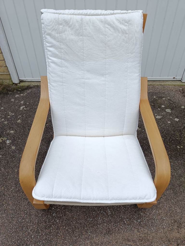 IKEA poang chair with cream cotton, machine washable cover - cover washed before advertising. Good used condition with one small rip on one side of the chair's cover, which is not visible from front or when in use. Wooden frame. Frame can be dismantled for transport if needed.