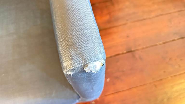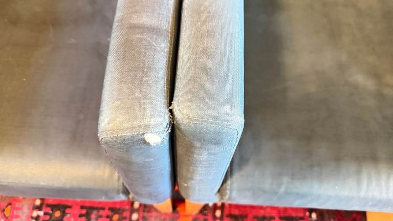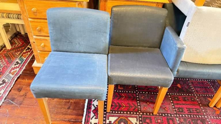 4 dark blue box chairs, 2 light blue armless chairs, 2 dark blue armless chairs. All padded. Box chairs have a slightly acrylic feel to the fabric. All are worn and in need of upholstering. All in good condition, stability-wise, and are solid.