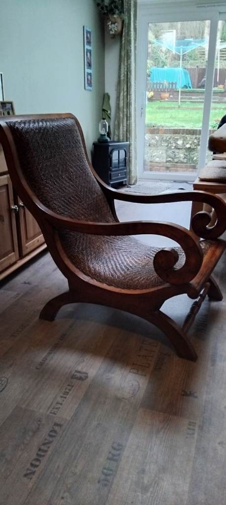 I am selling a large,oak stained wood and wicker chair. Measurements are - 1 metre depth ( to include slope back), 60 cm wide, 1 metre height.