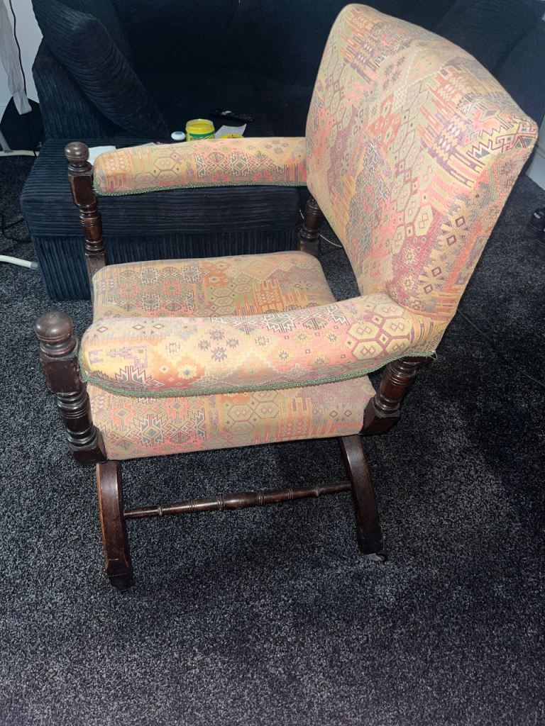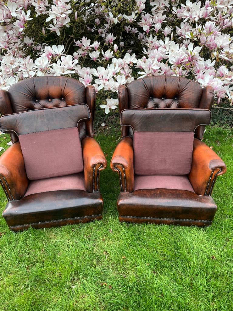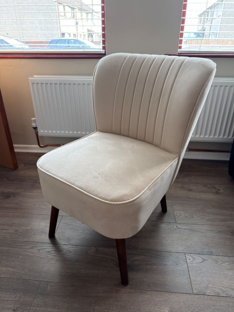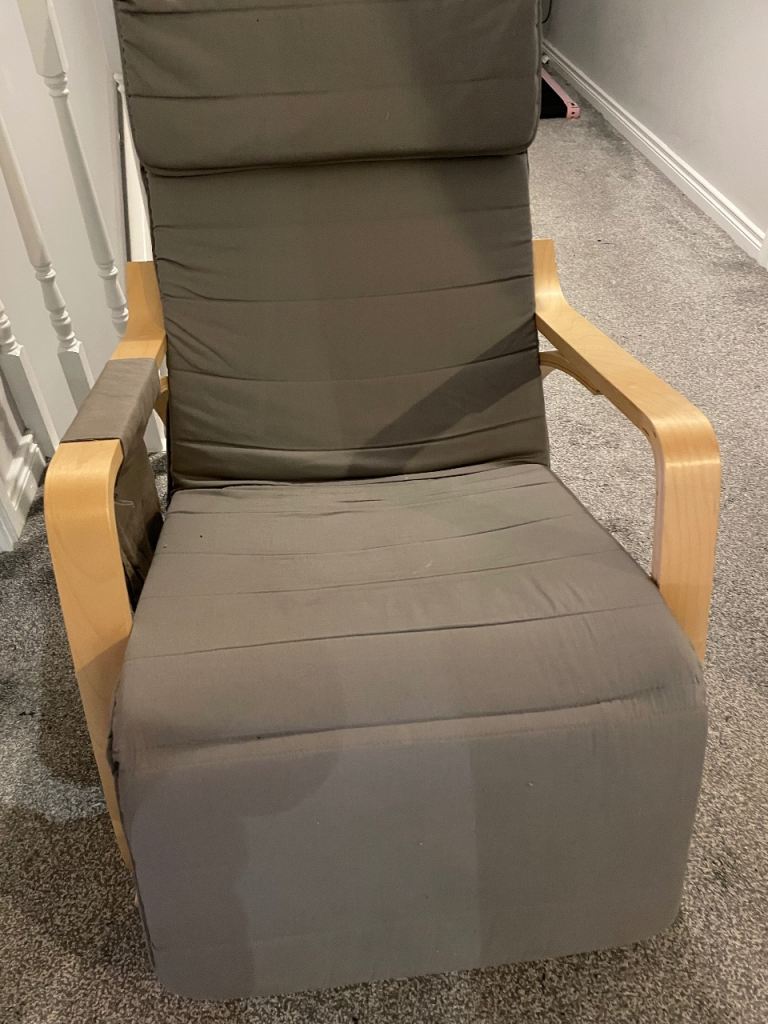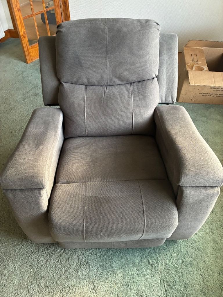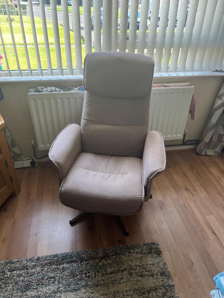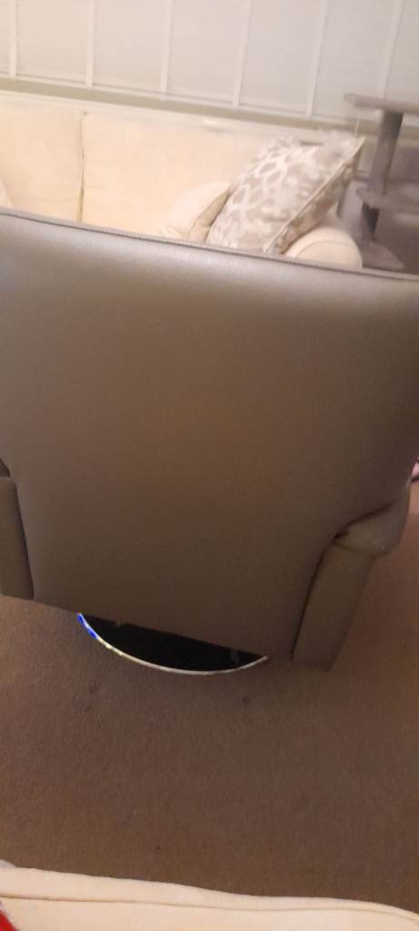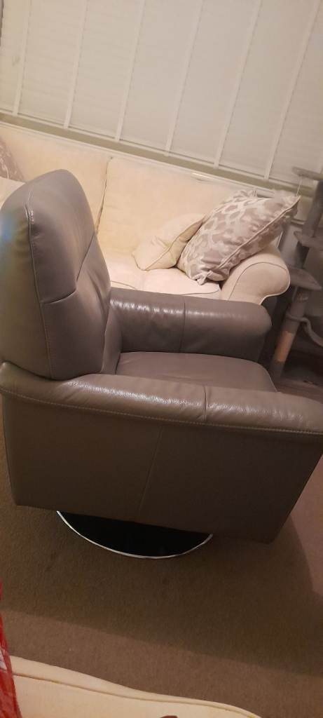 Grey/Taupe leather swivel chair. Very comfortable. Not needed. Occasional squeak. No marks or rips.