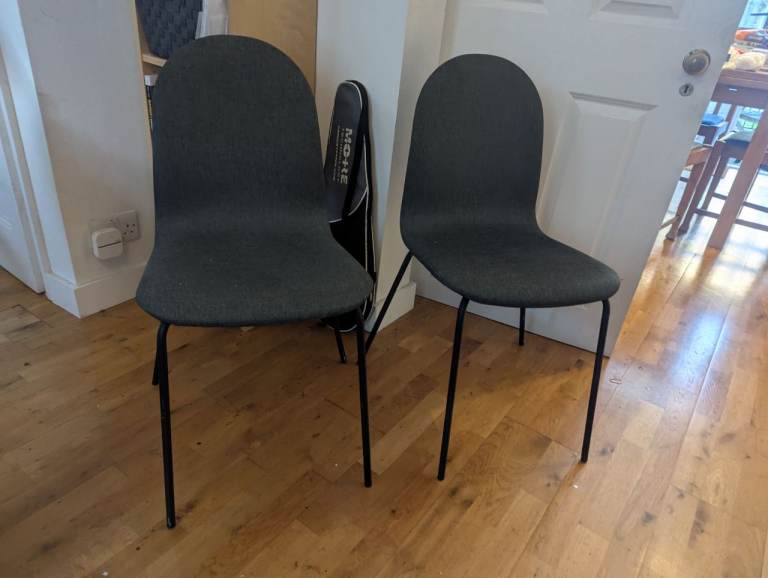Pair of stylish grey fabric dining chairs With black legs.
