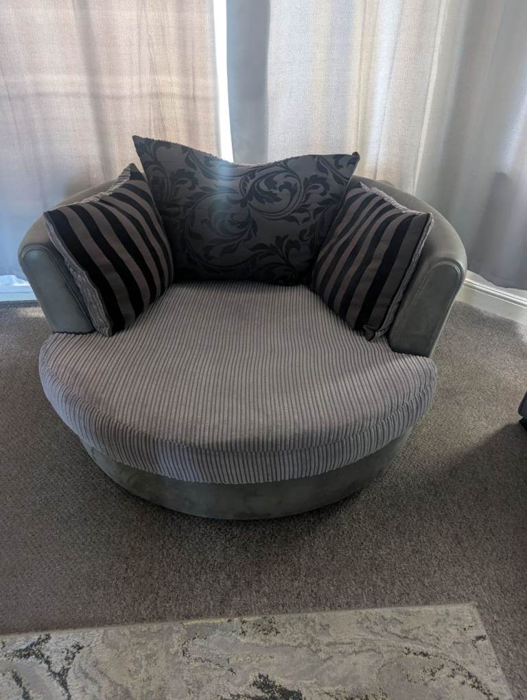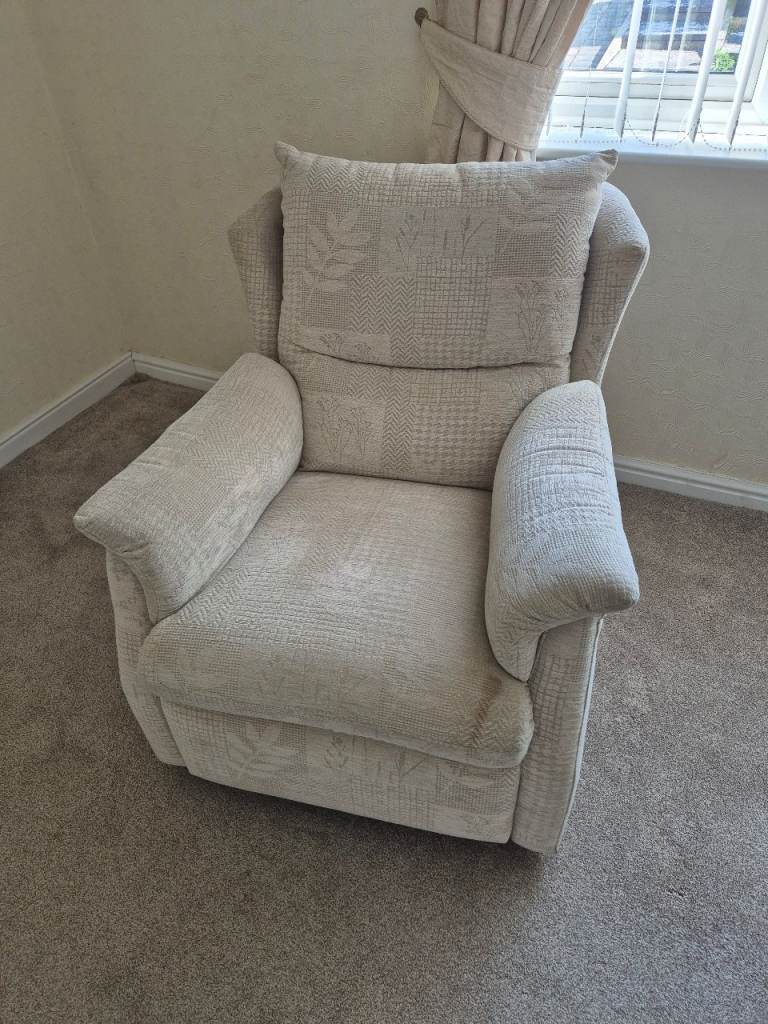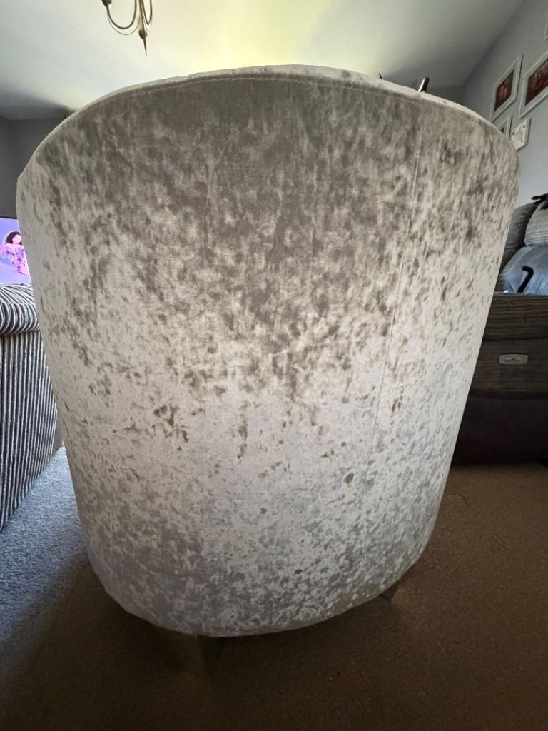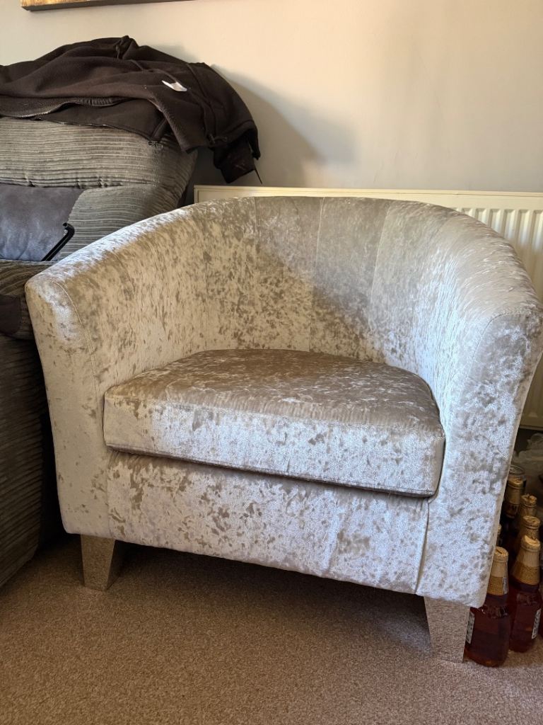 A velvety feel occasional chair in a champagne / silver colour. Hardly used. Very good condition. Collection only