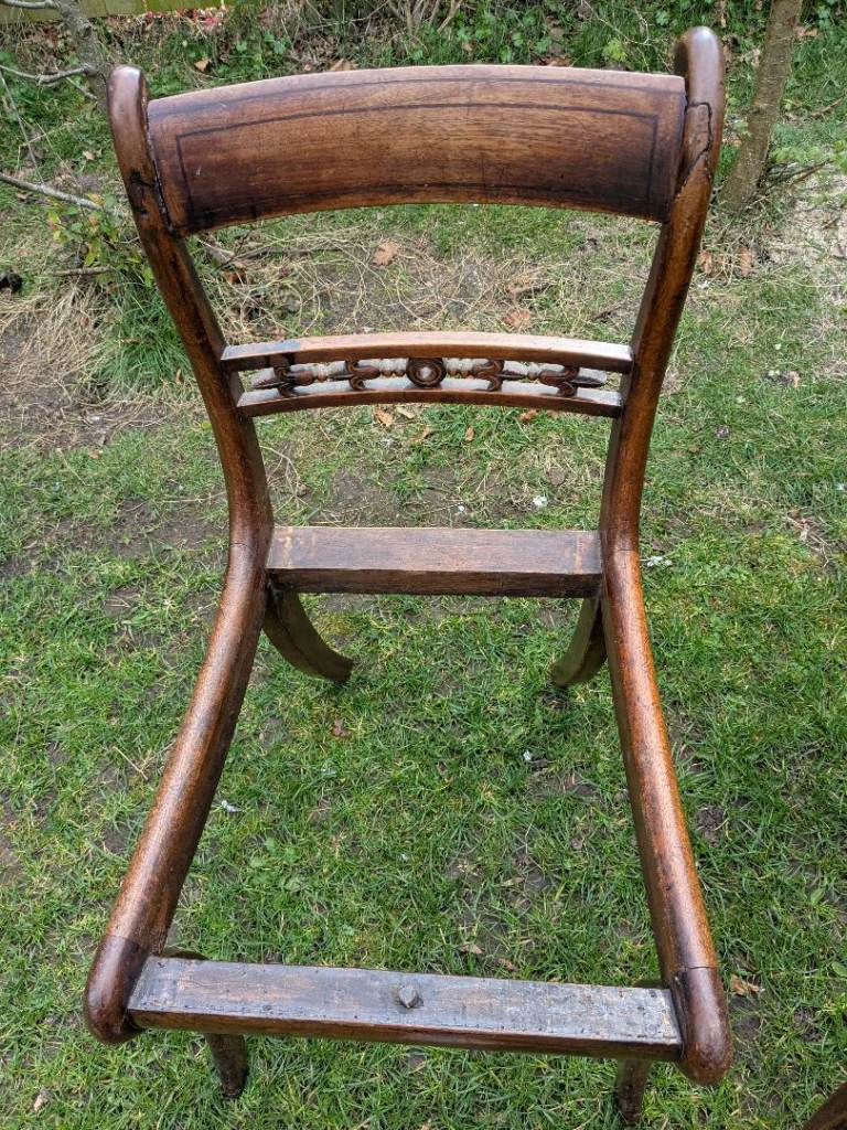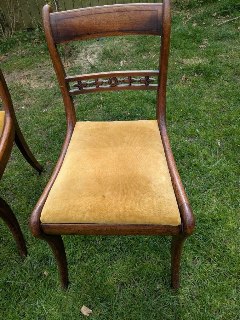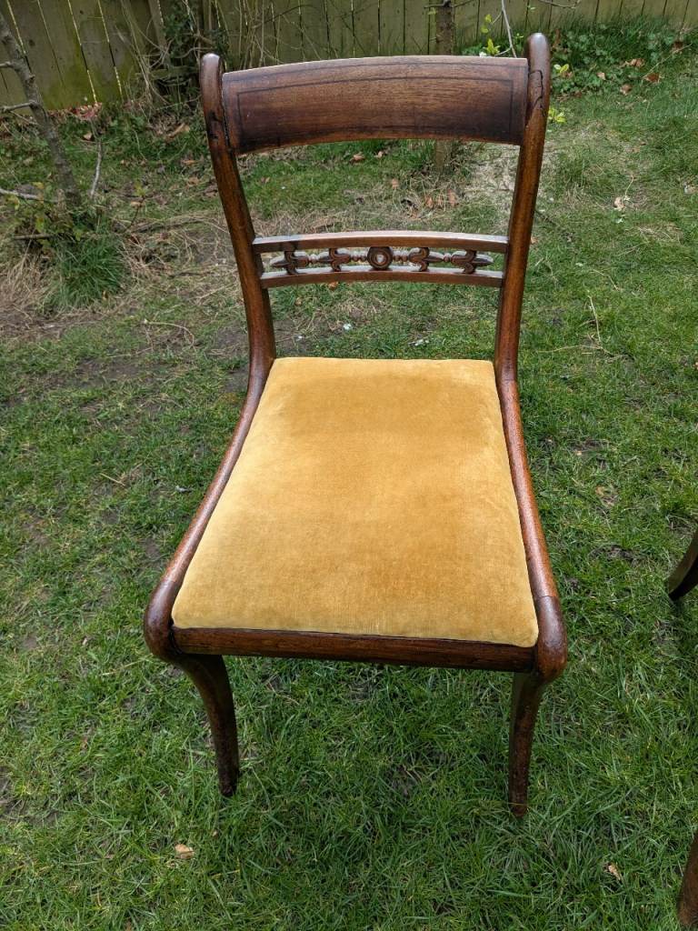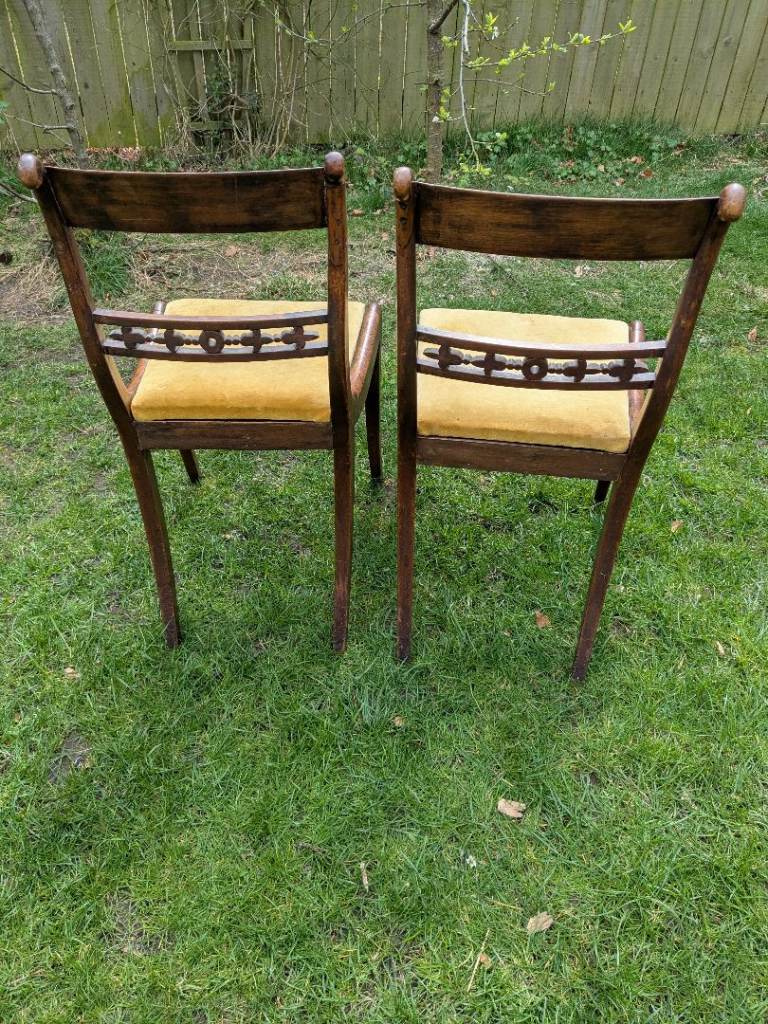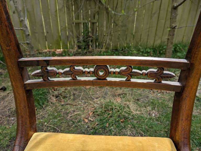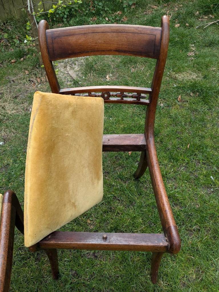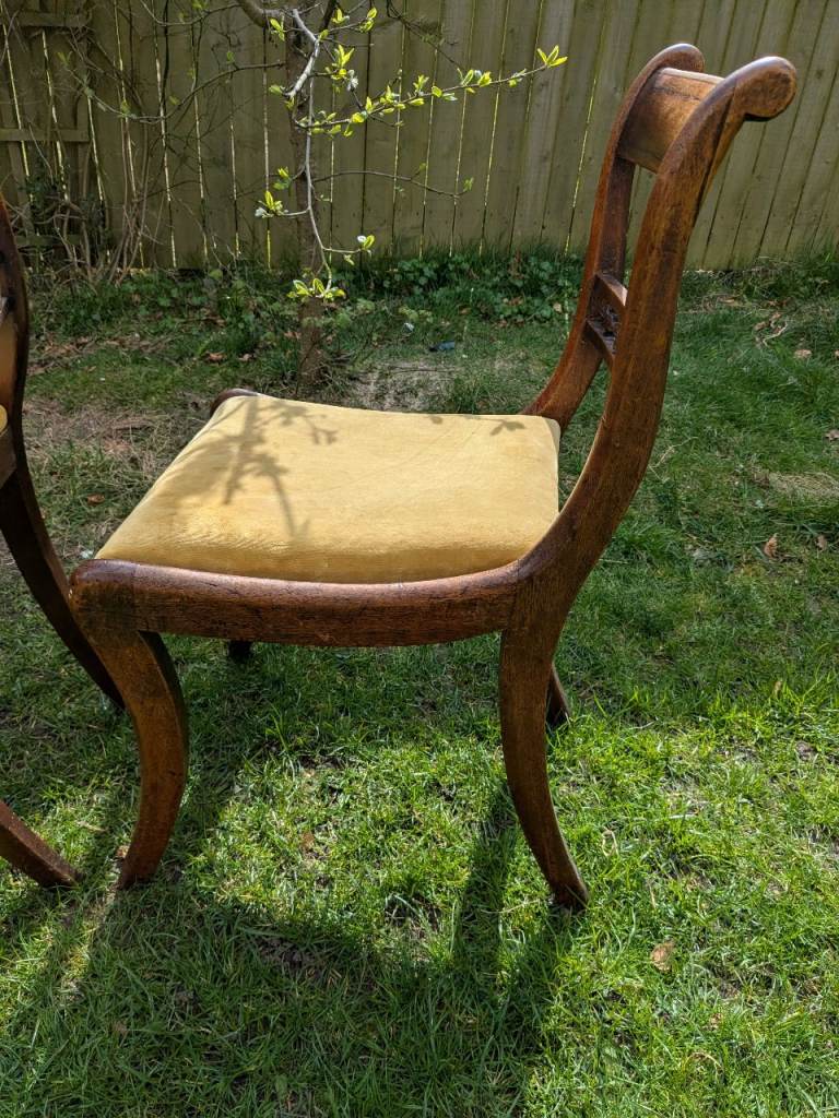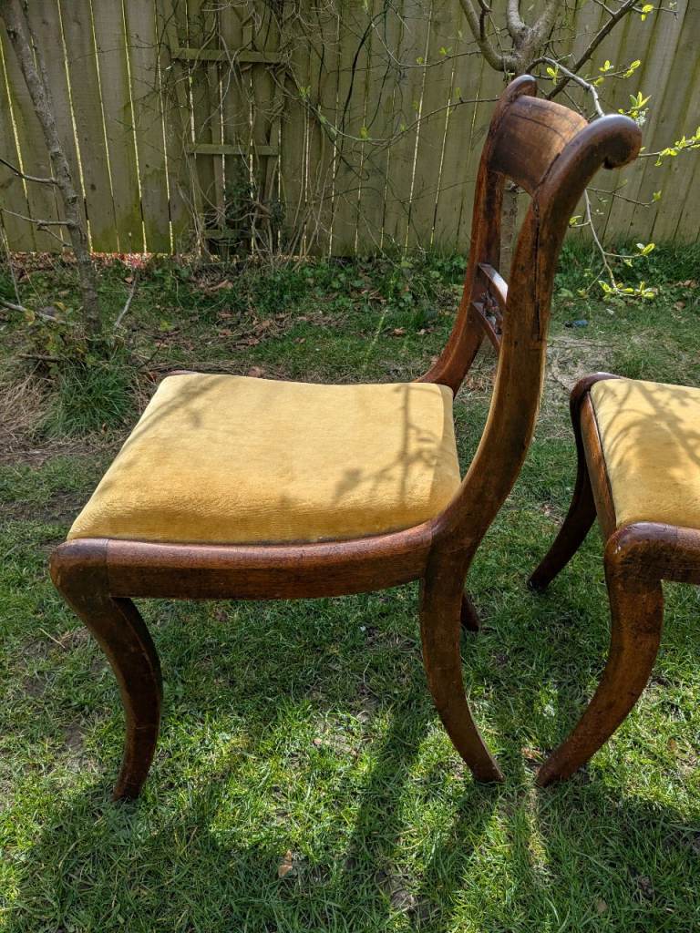Two lovely antique dining chairs with yellow velvet seating.