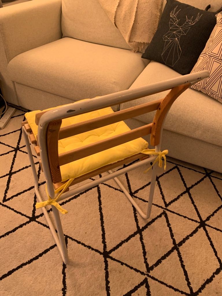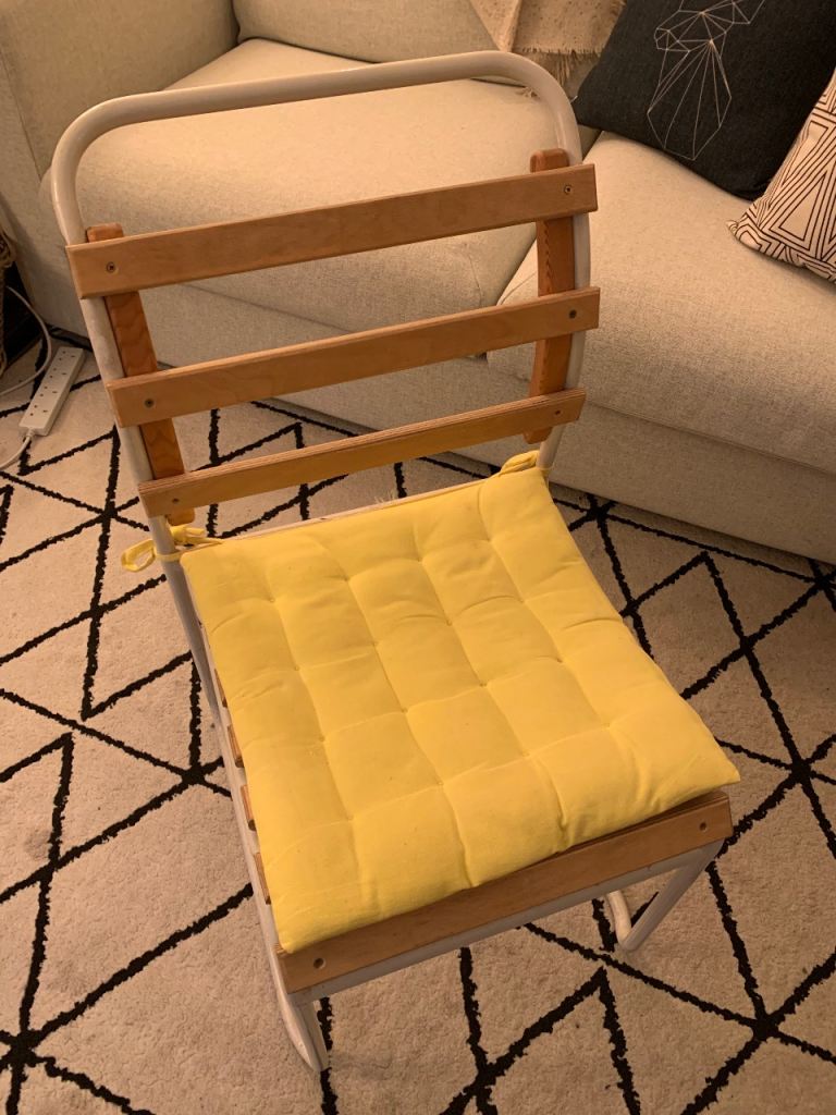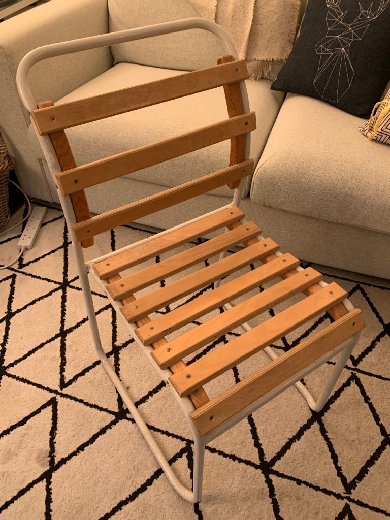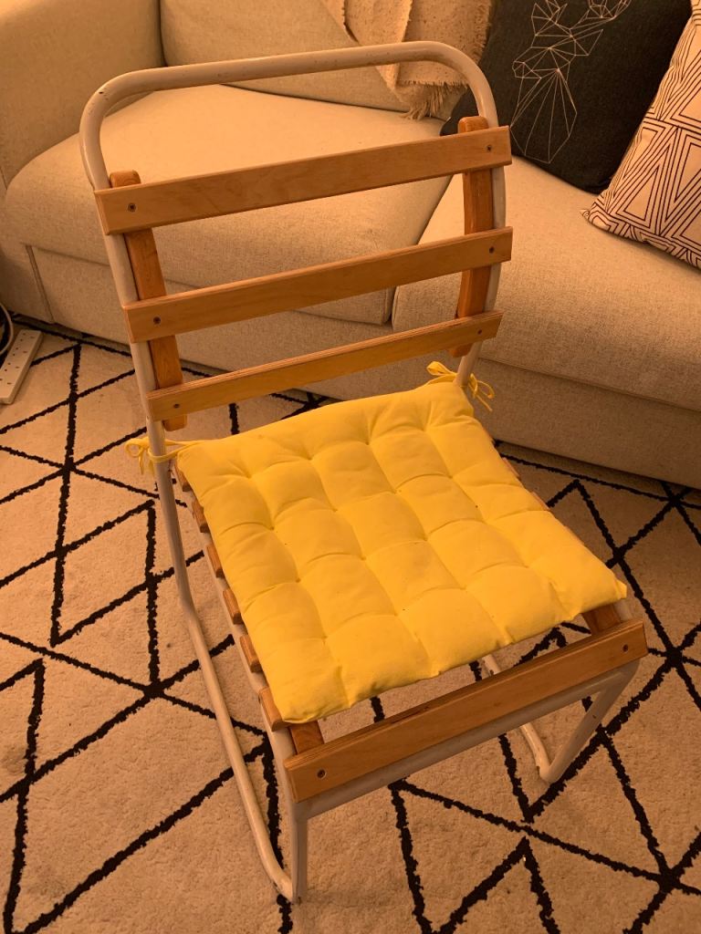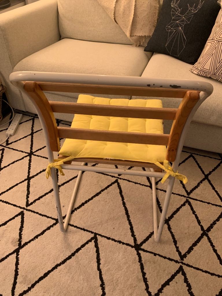 Posting for 18+ yearsPair of Vintage slatted stacking chairs with cushions