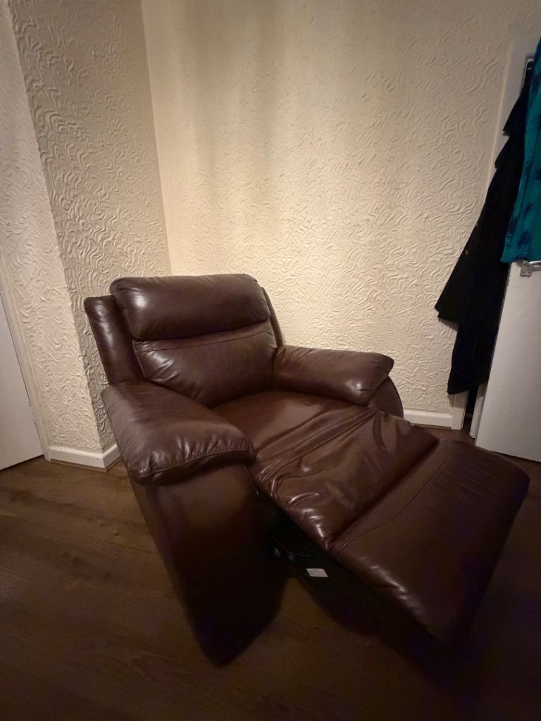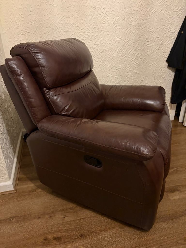 Bought these as a set, and recently moved to a smaller home and they now do not fit in the living room. I can only keep one and want to sell the other. Only had them for 2-3 years. Genuine leather from Harveys. Please no time wasters, need the chair gone as soon as possible. COLLECTION ONLY. URGENT. £120 open to negotiation.