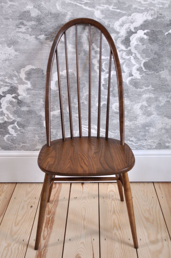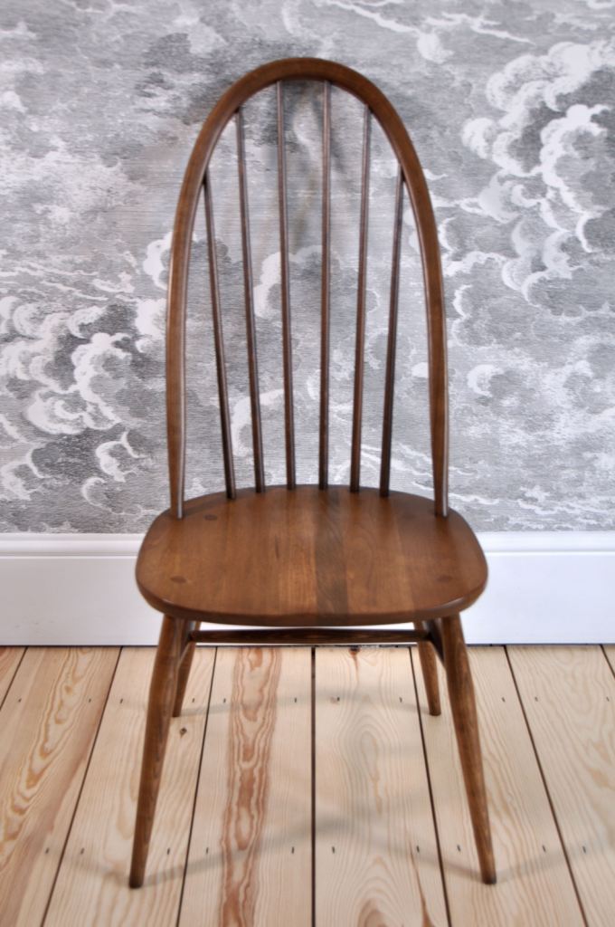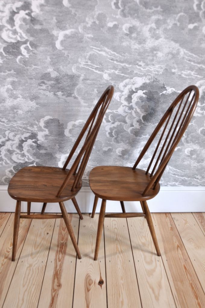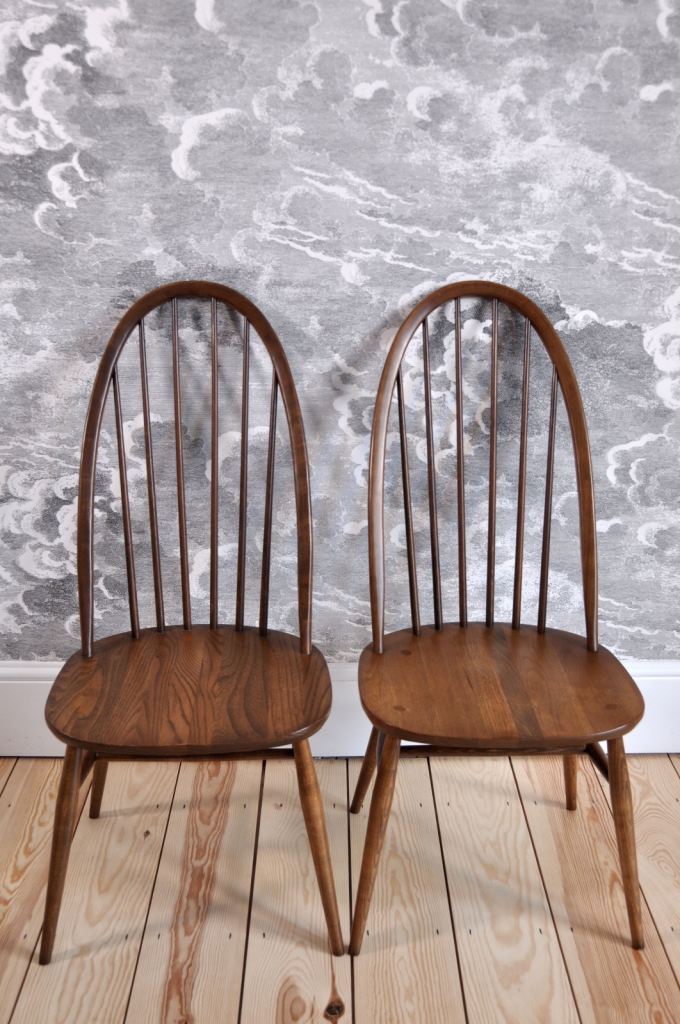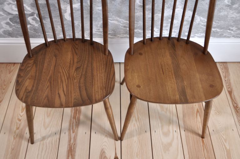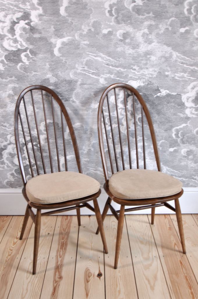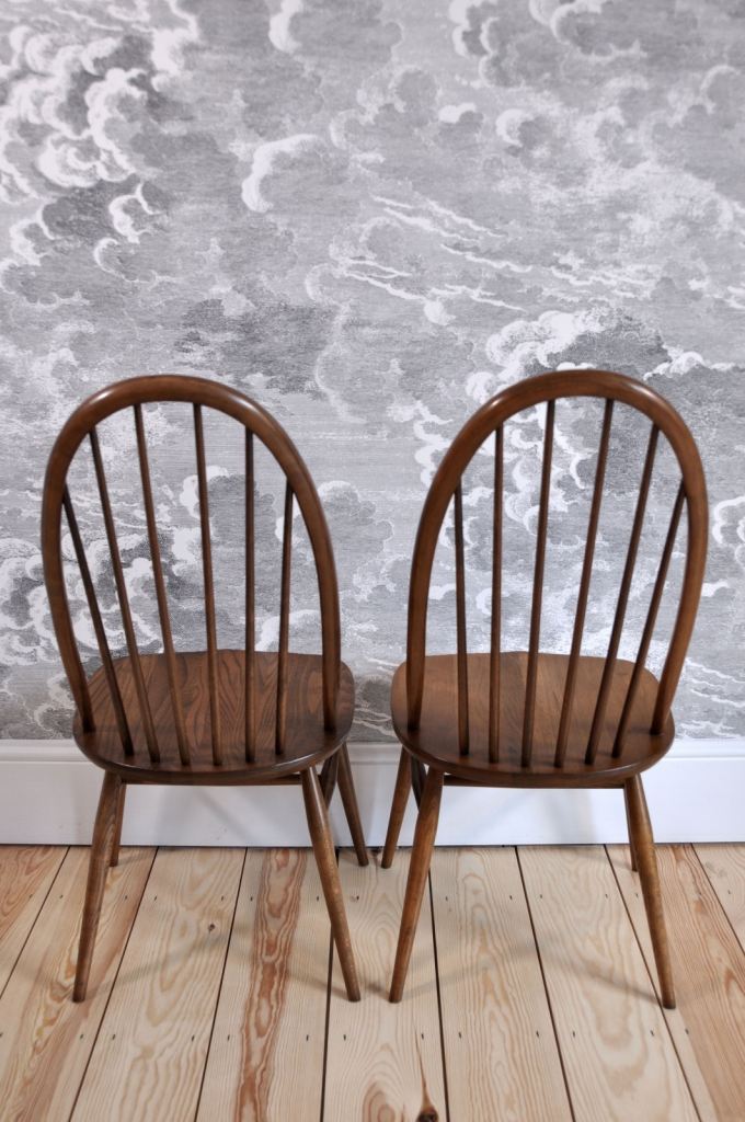 The chairs are in excellent (original) vintage condition with some light marks commensurate with age and use. They are free of any damage, splits, repairs or wear to joints. The chairs are sturdy with no loose joints or spindles and no separation to the elm seat. They have been cleaned and waxed.