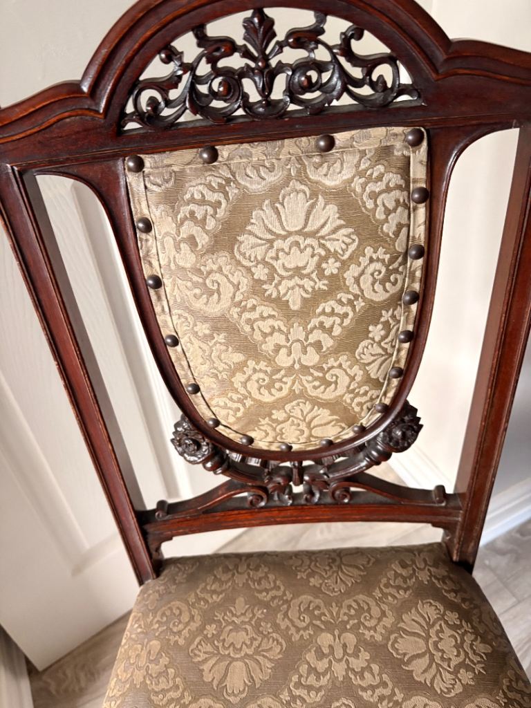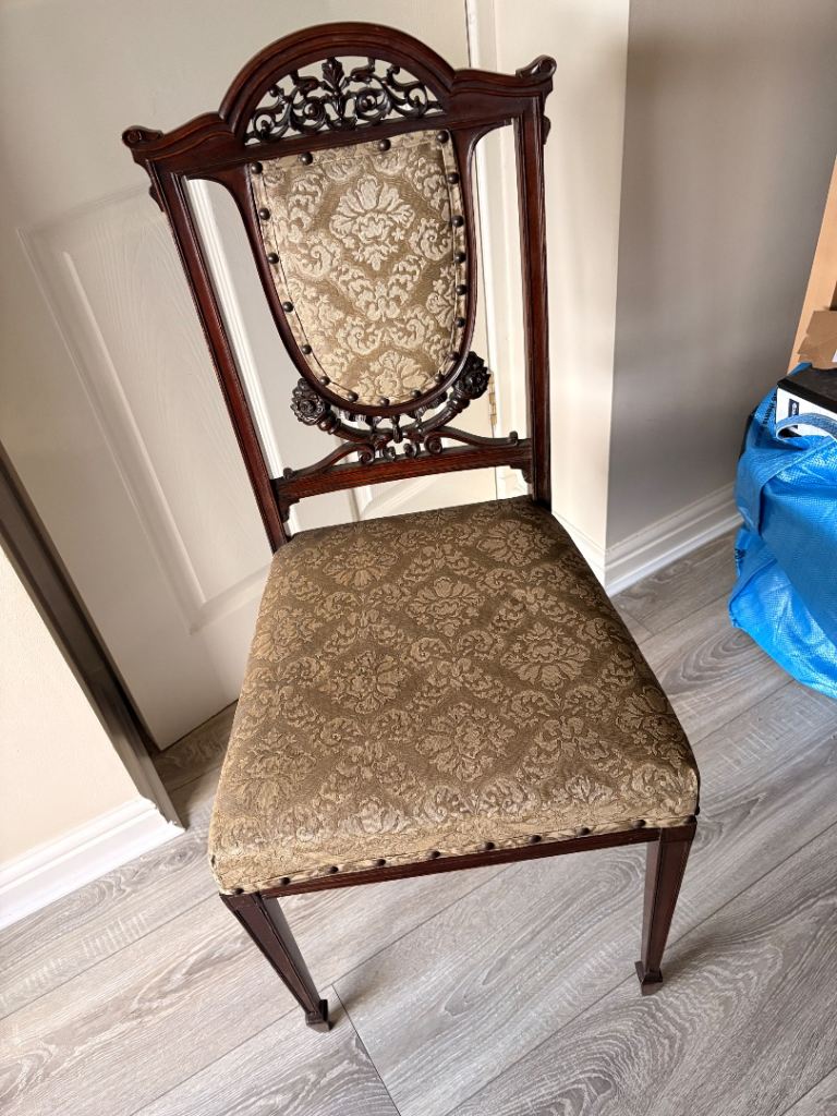 Dark wood dining chairs with original upholstery- potentially antique. Looking for £20 per chair. Collect from Paisley only.