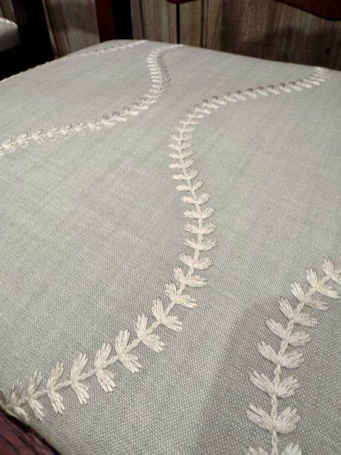 Very good condition, solid joints. Chairs are made from oak and feature seats upholstered with a new , elegant fabric. A few scratches and discoloring on chairs due to age.