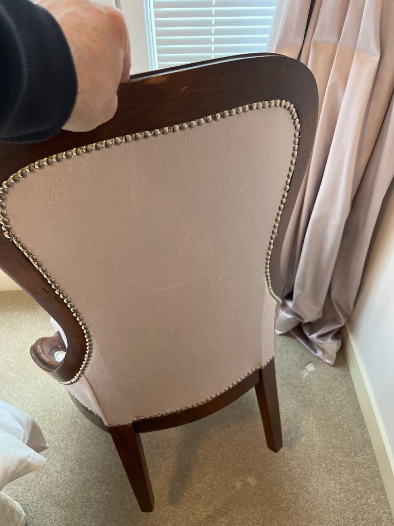 Lovely bedroom chair with a dark wood frame and pink velvet upholstery.