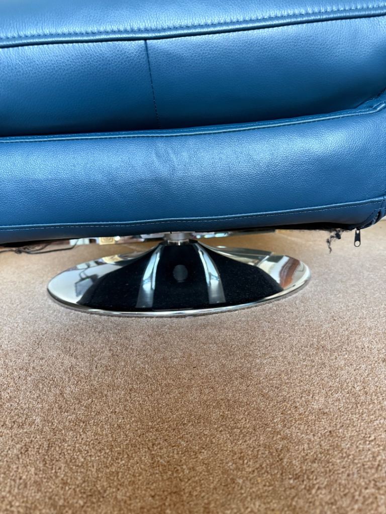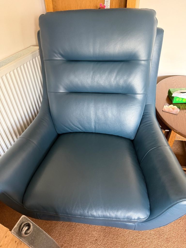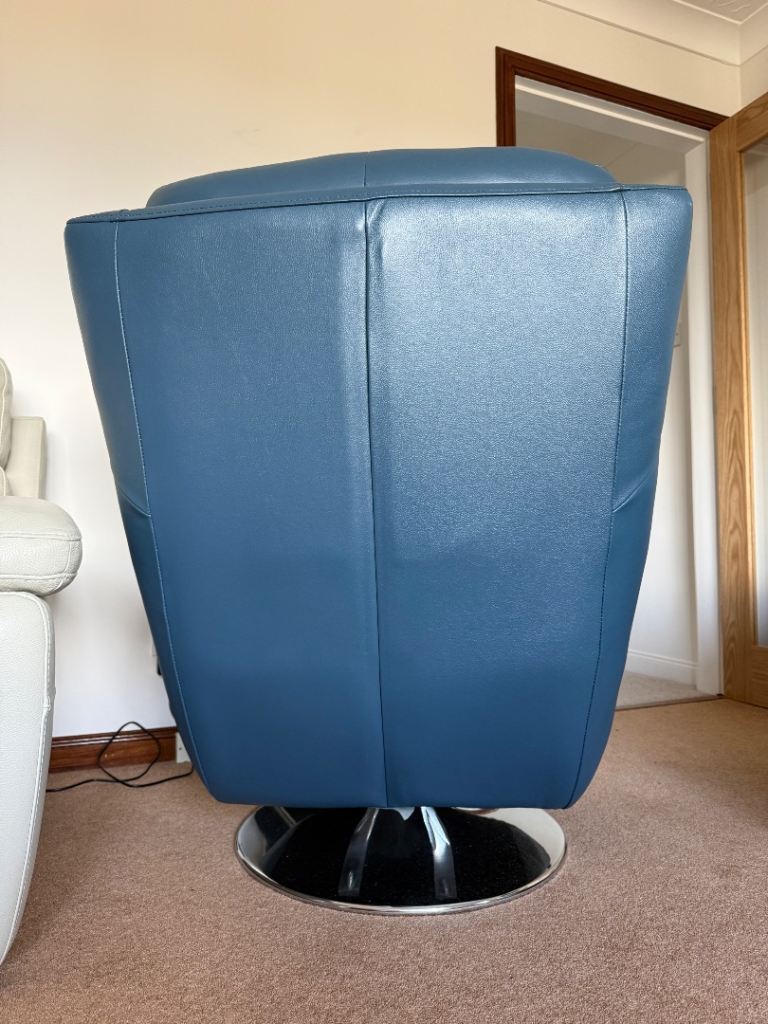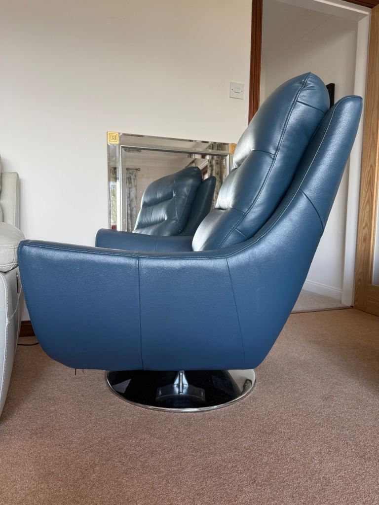 Pair of leather swivel chairs in excellent, almost unused condition. Well made, purchased from Sterlings, thought to be Italian leather in airforce blue/grey, really smart colour. Pictures show the colour really well. 44inches high, 36ins wide, 36ins deep.