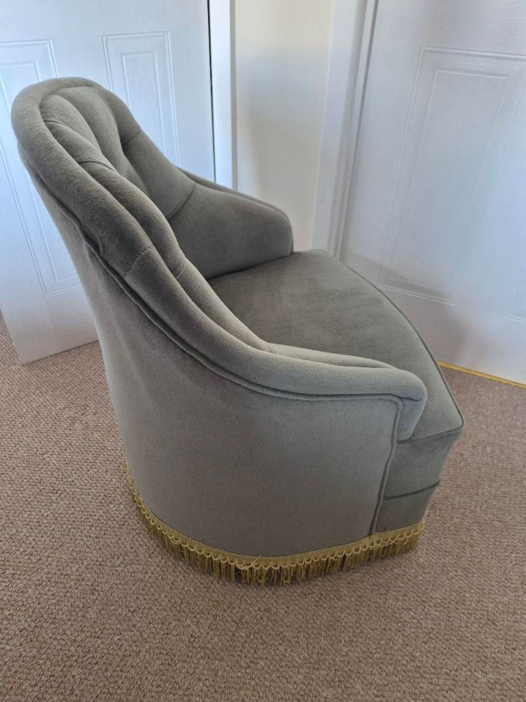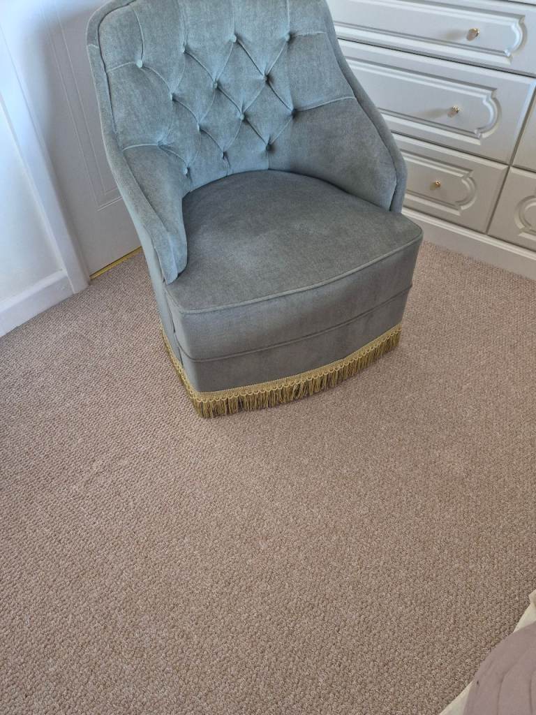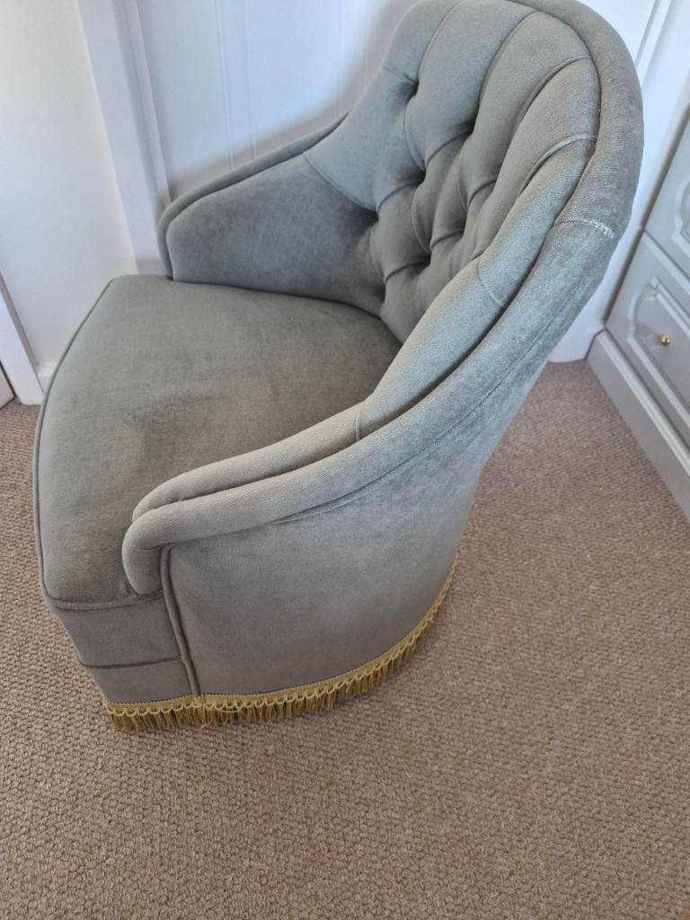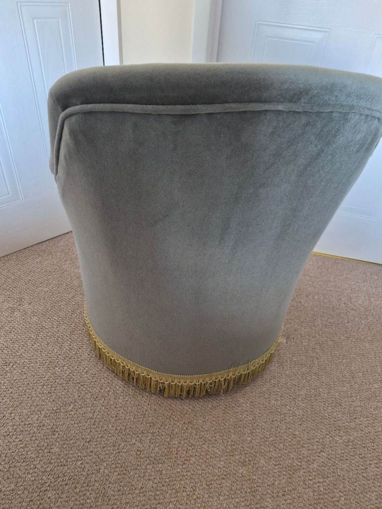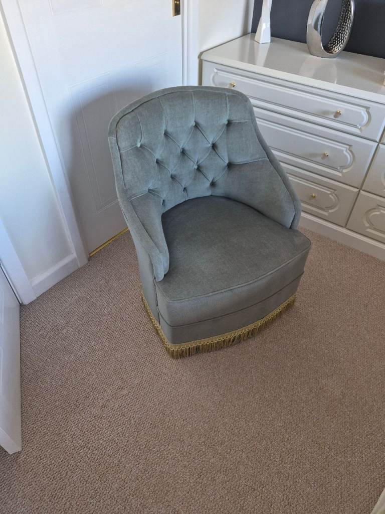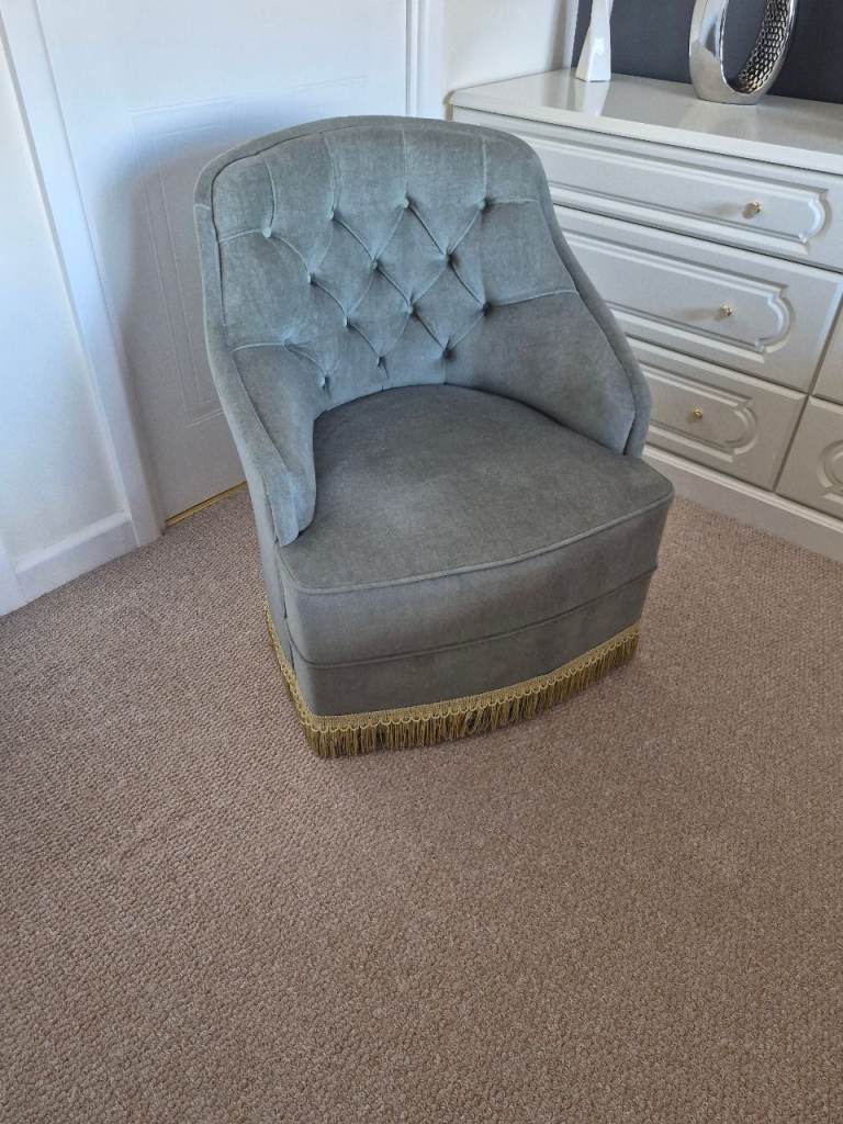 Vintage looking Tub Chair. Green in colour with gold tressels. Chair is on castors so highly mobile. In excellent condition form a smoke and pet free home.