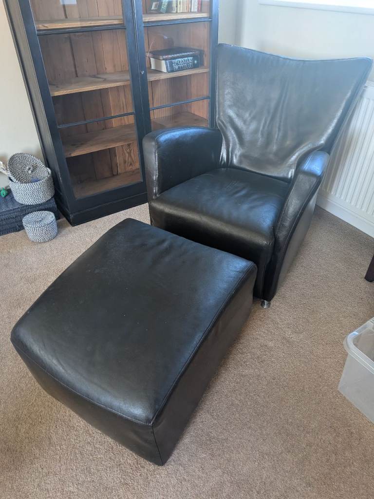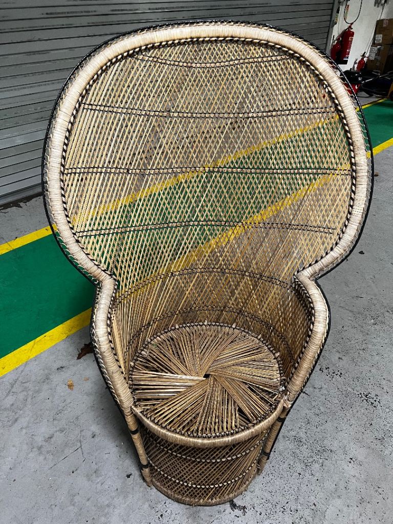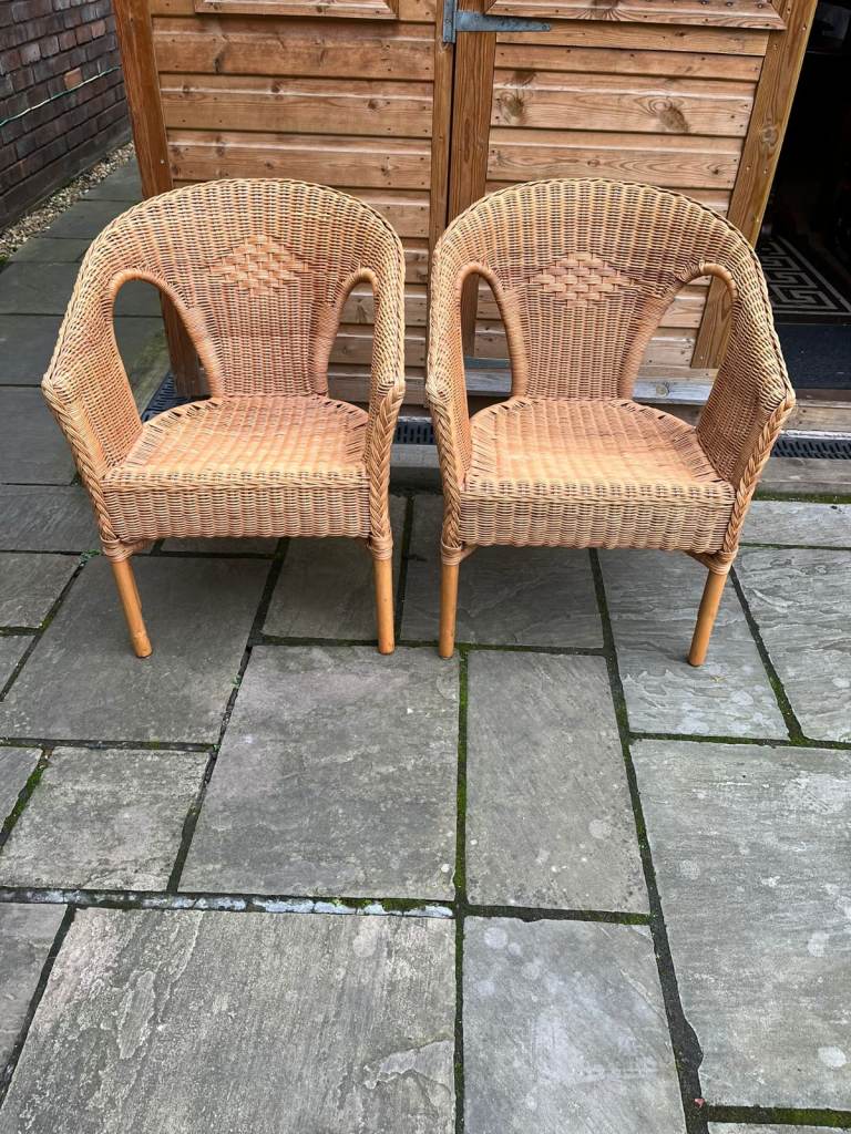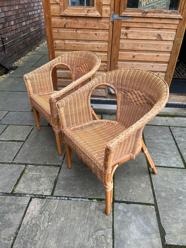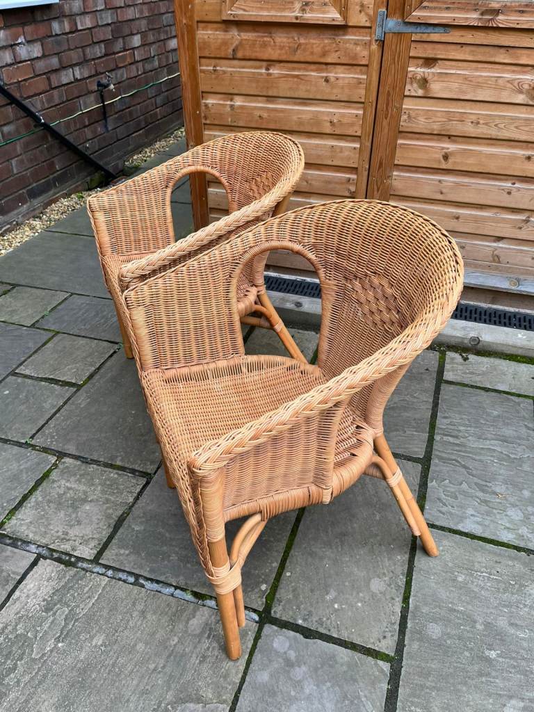 Two adult size four legged wicker chairs.