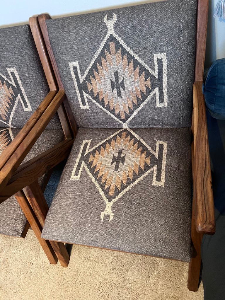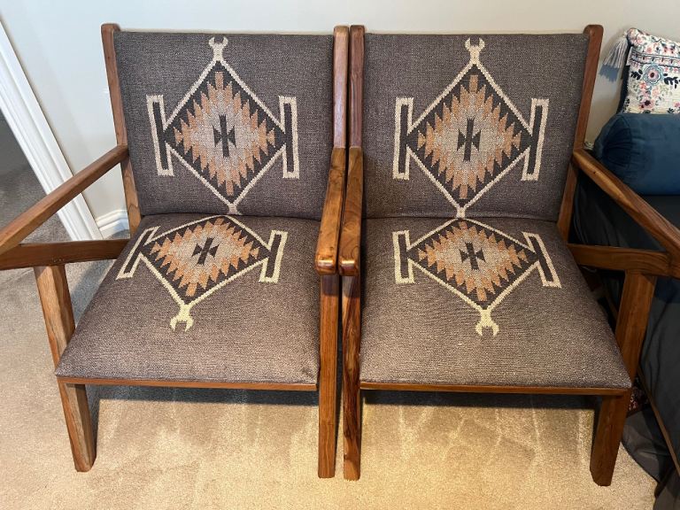 Posting for 7+ yearsTwo Wooden Chairs with Patterned Multicoloured Upholstery – Good Condition