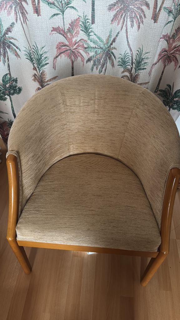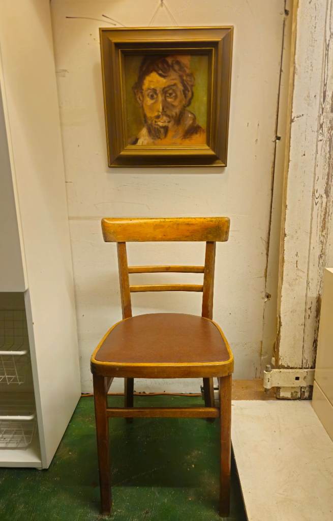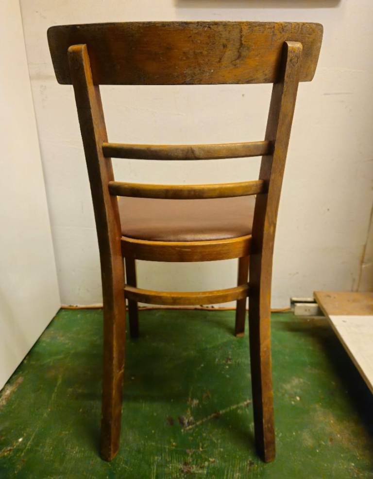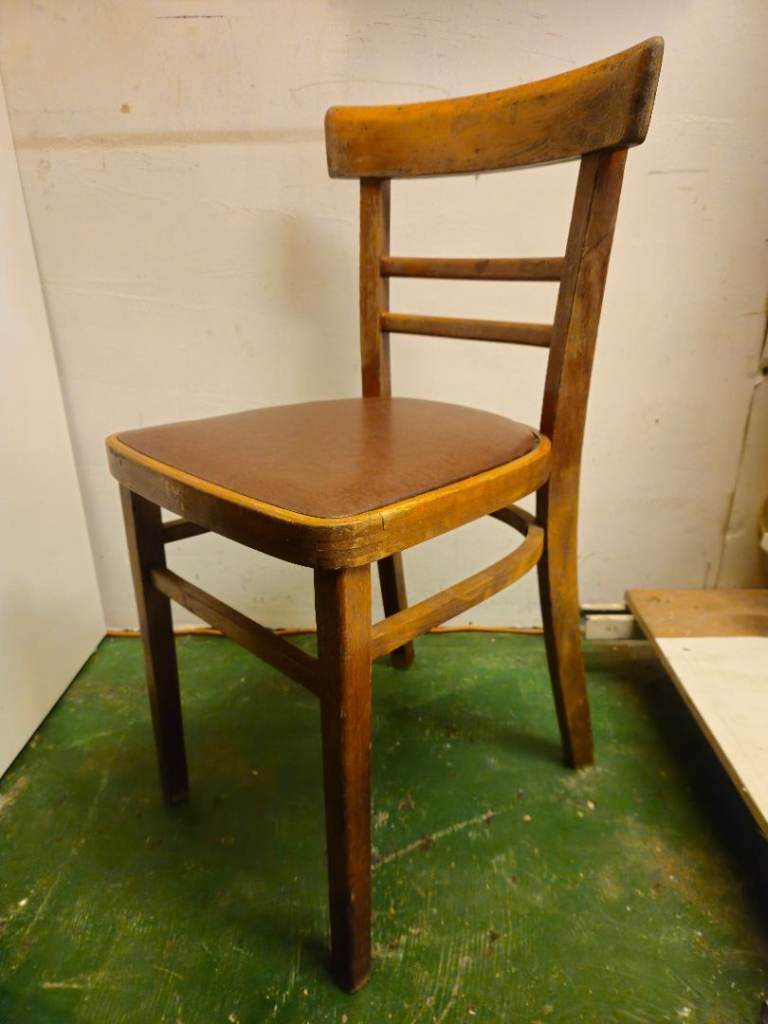 Genuine vintage beech wood chair with original brown vinyl seat cover.