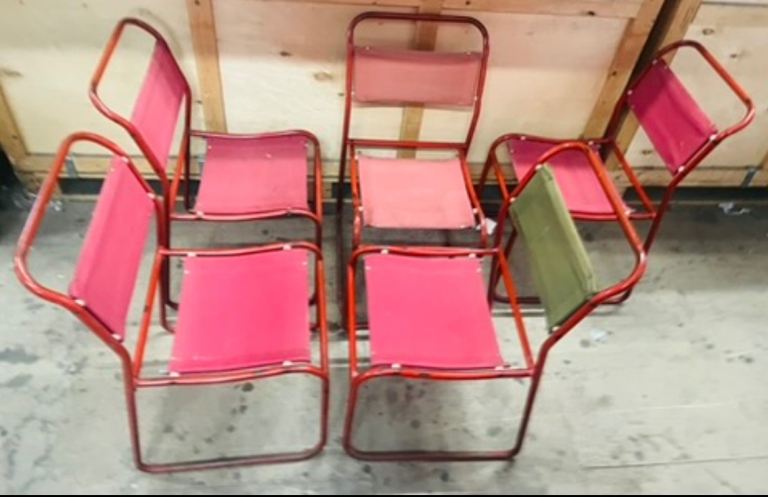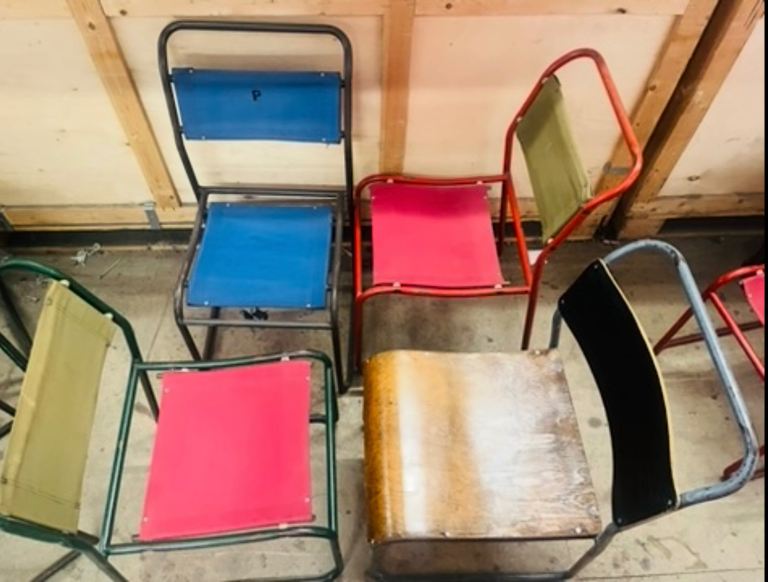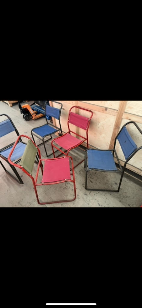 £40 each. Thirty midcentury vintage stacking chairs by cox. 15 Red. 15 blue.
