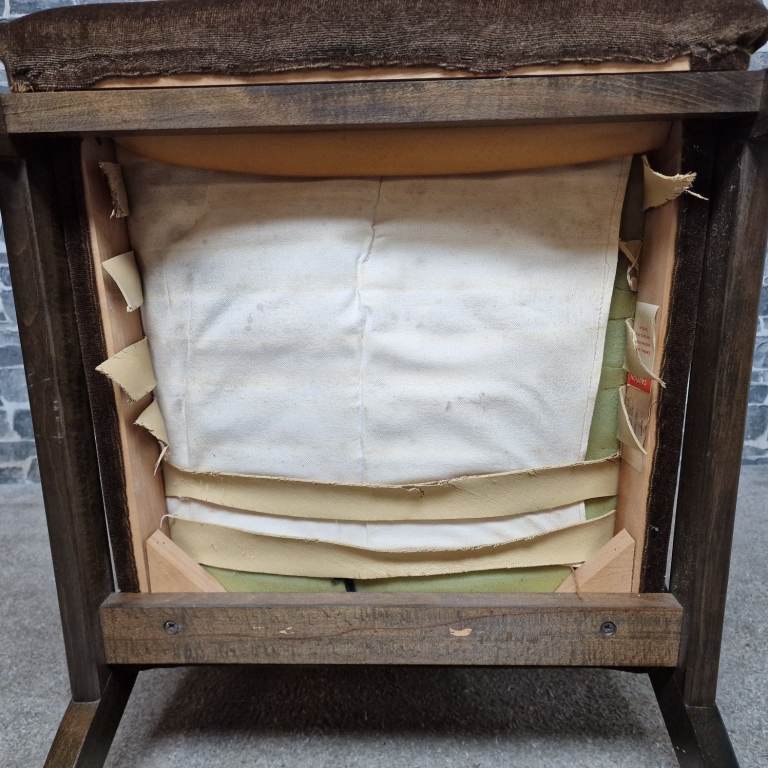 The chair needs attention underneath — some of the webbing/belts have come off, as shown in the photos. Because of this, it is best suited as a restoration or upholstery project. The upholstery itself shows general wear consistent with age.
