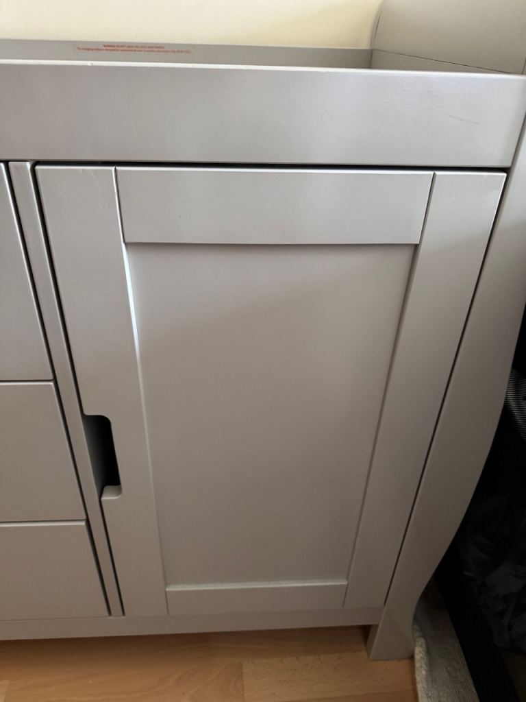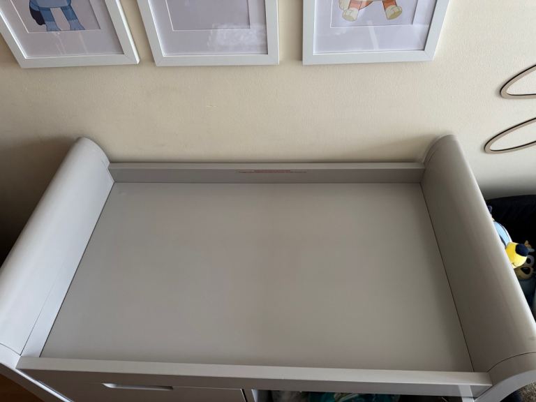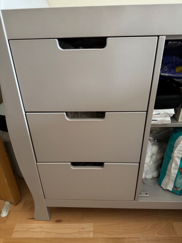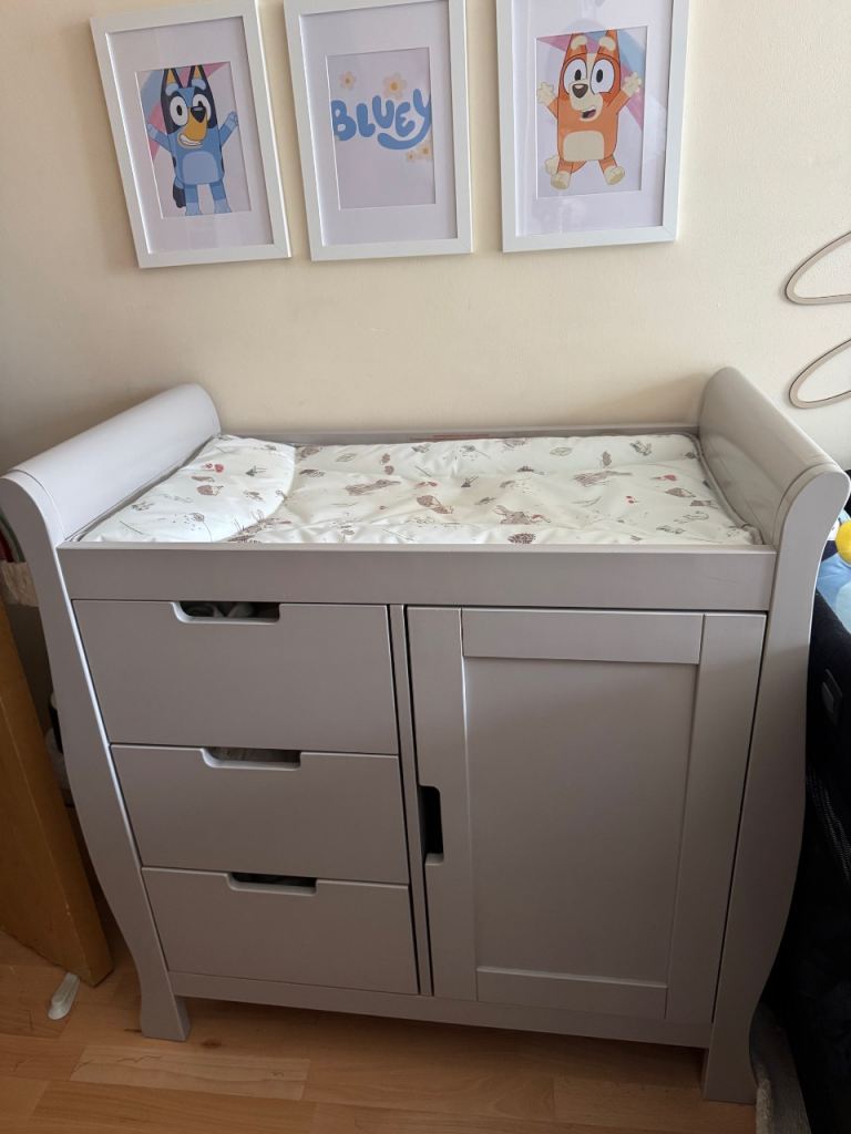 Stamford changing table, the perfect fit for parents searching for a chic and elegant option to furnish their little one’s first nursery. This beautifully crafted dresser is constructed from Solid + Manufactured Wood and consists of three generous drawers on the left-hand side, while the right features one full-length cupboard with a handy adjustable shelf, meaning plenty of storage options for all of the baby’s changing essentials. There is also a cleverly modeled space on the top which is perfectly sized for the use of a changing mat, while recessed handles have been cleverly utilized to create a stylish and uncluttered look and ensure the units are snagged-free and simple to use. I’ve had the unit 7 months use but baby to big to use, this unit is already assembled and did arrive with a few marks on the panels. They cost £250 new and are of a high quality.