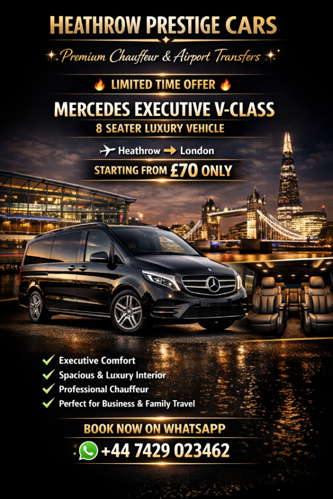 Whether you choose a spacious V-Class, a prestigious S-Class, or an executive E-Class, our chauffeur service from Heathrow to London is designed to exceed expectations. With competitive pricing starting from £70, flexible booking options, special discounts, and a commitment to excellence, we provide a luxury travel experience you can trust. When comfort, reliability, and professionalism matter, our chauffeur service is the clear choice.