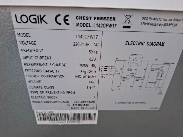 140 L Logik chest freezer
