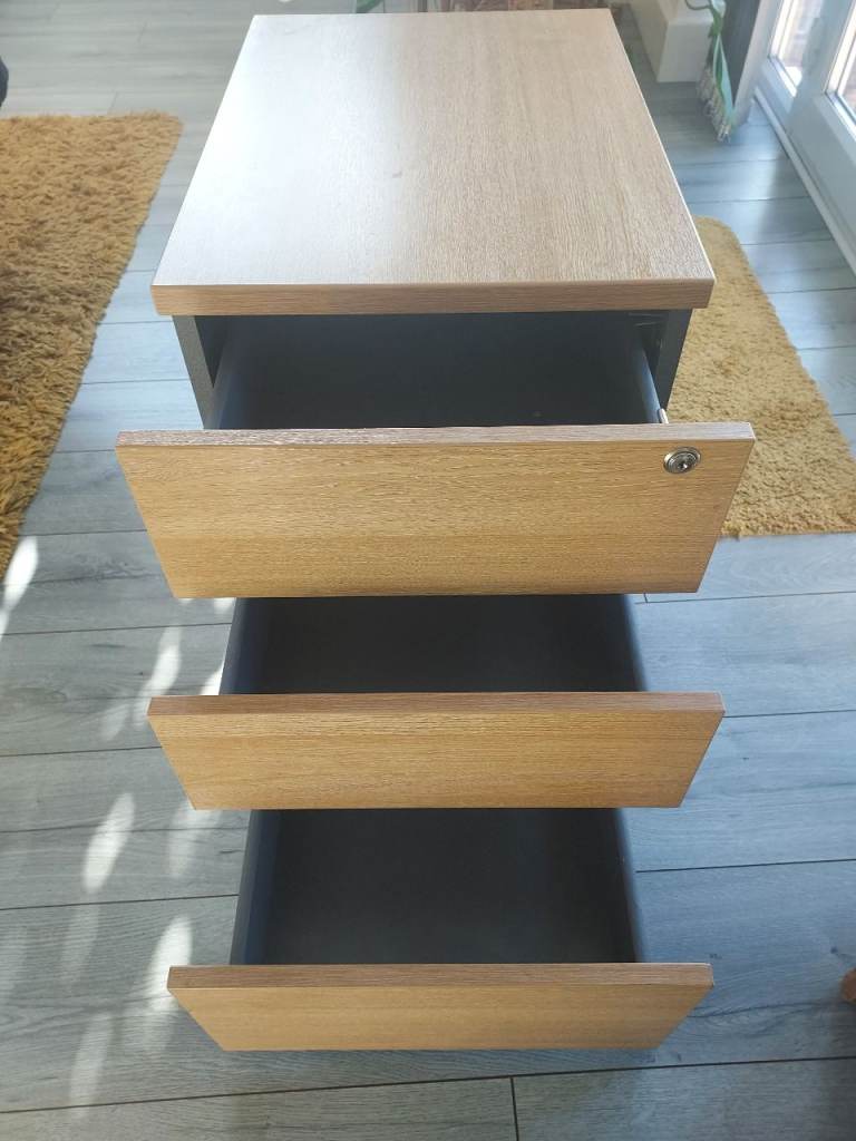 Clean and sturdy 3-drawer office storage unit in oak finish.