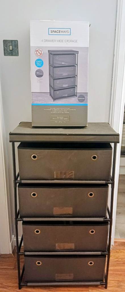 4 drawer shelving/storage unit, drawers never used. Complete with box and instructions. Lightweight & portable