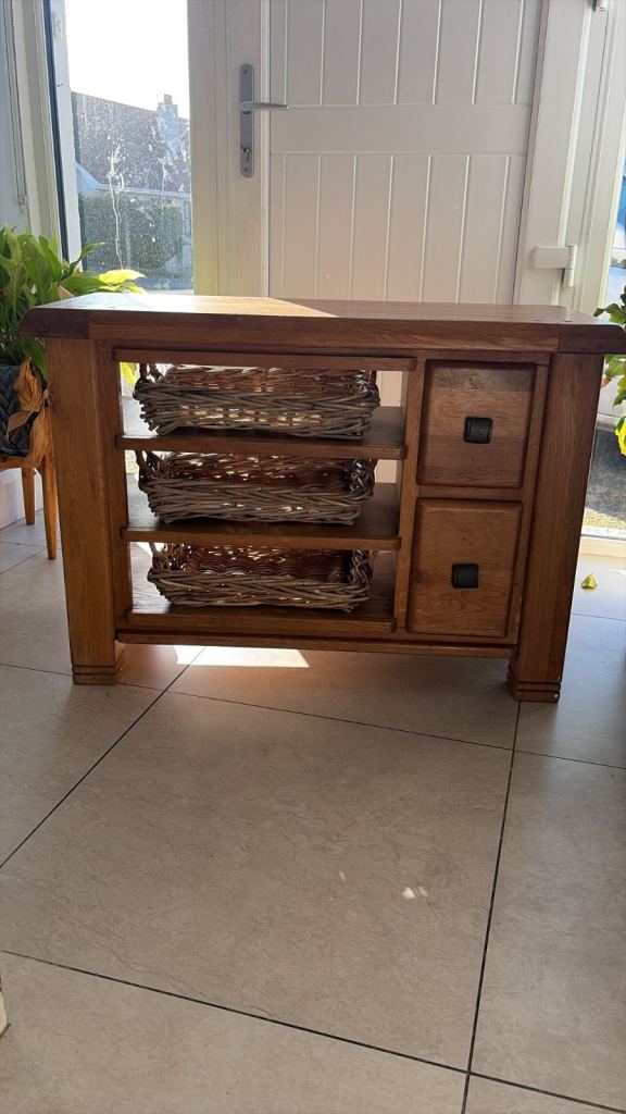 A solid pine country, chunky TV unit with 2 full drawers and accessory baskets. It can be used for almost anything.