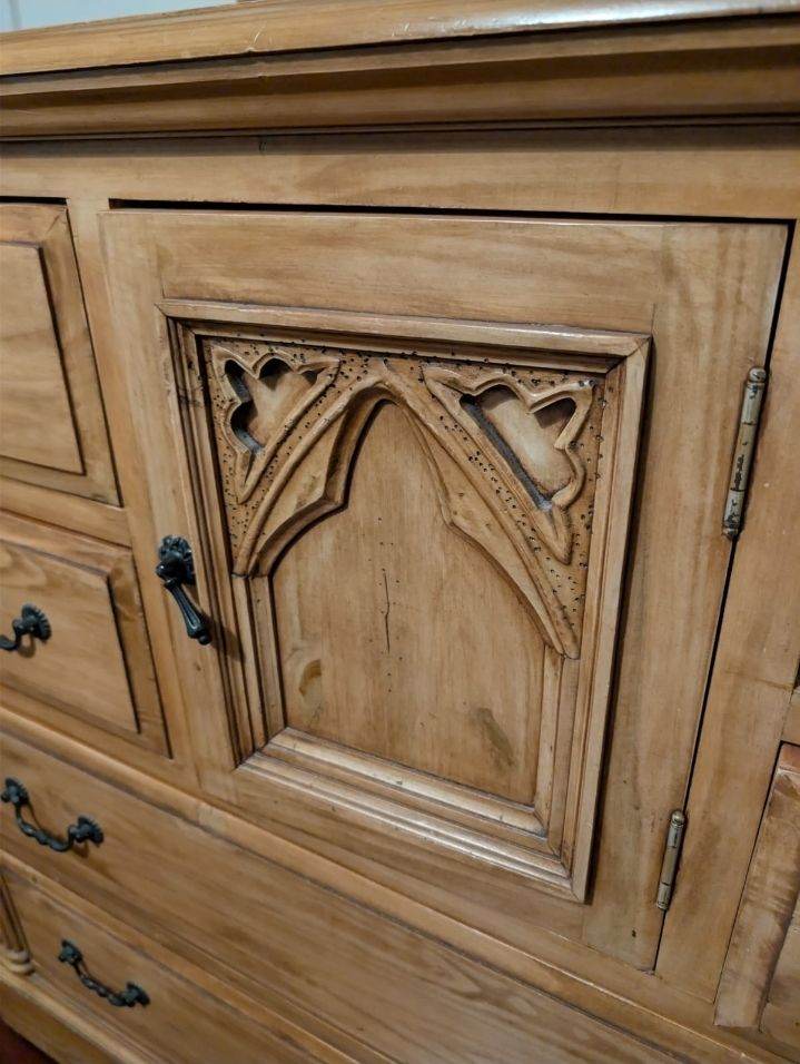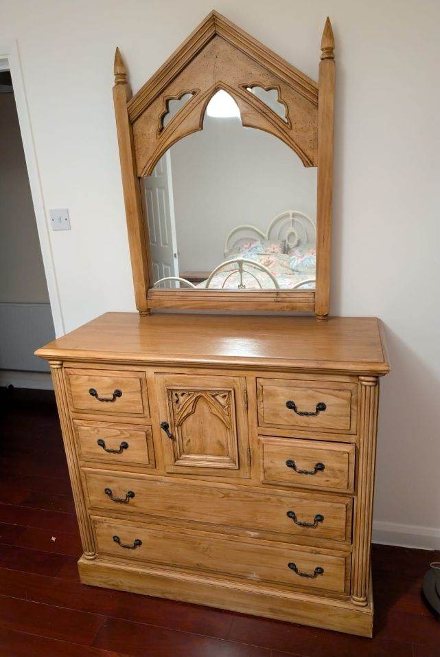 Gorgeous designer wooden dresser / chest of drawers and mirror. Solid real wood, Gothic style. Heavy high quality piece of furniture.