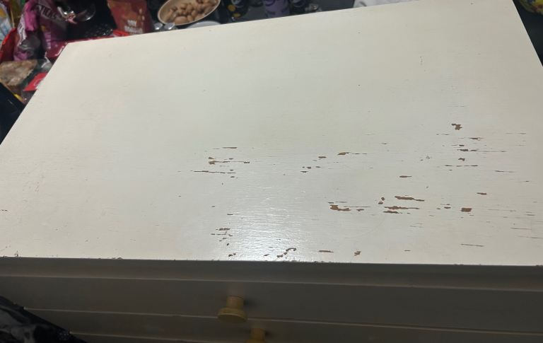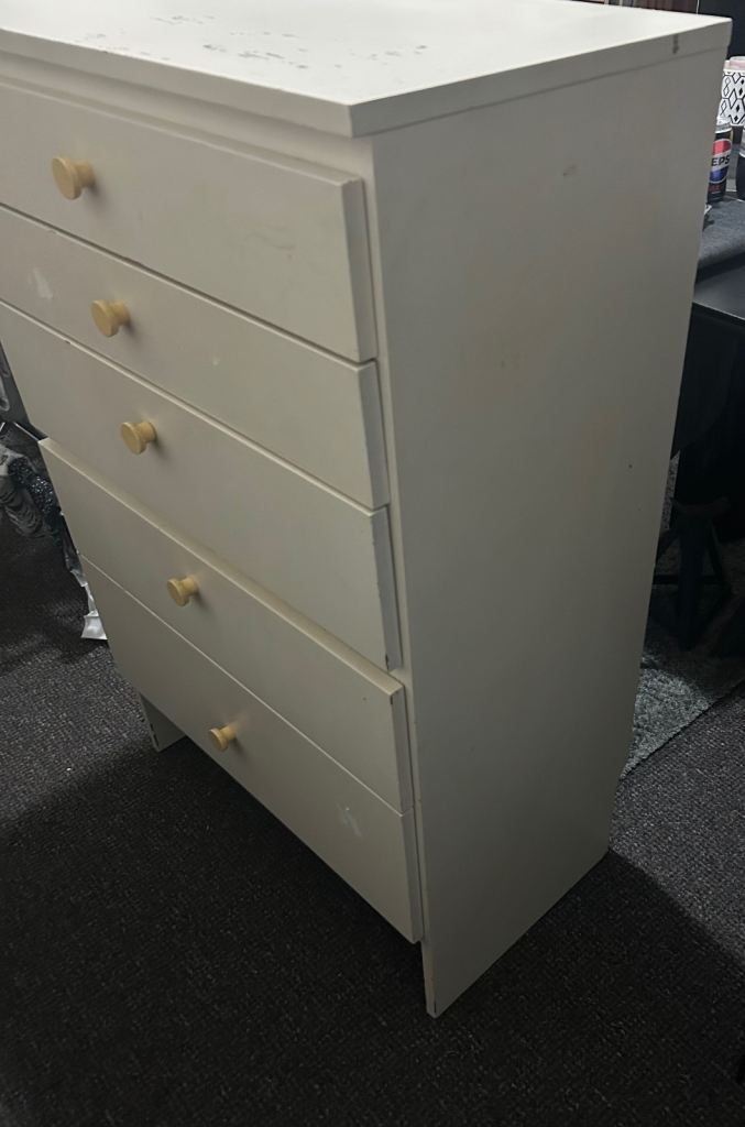 Solid dark wood Chest of drawers painted cream with tan coloured knobs. Has 2 smaller drawers at the top also has room for a little storage underneath. good solid piece of furniture could do with modernising as an upcycle project or a repaint. Also quite heavy Measurements