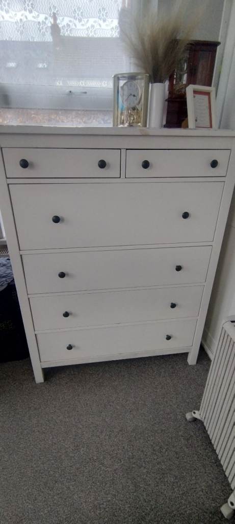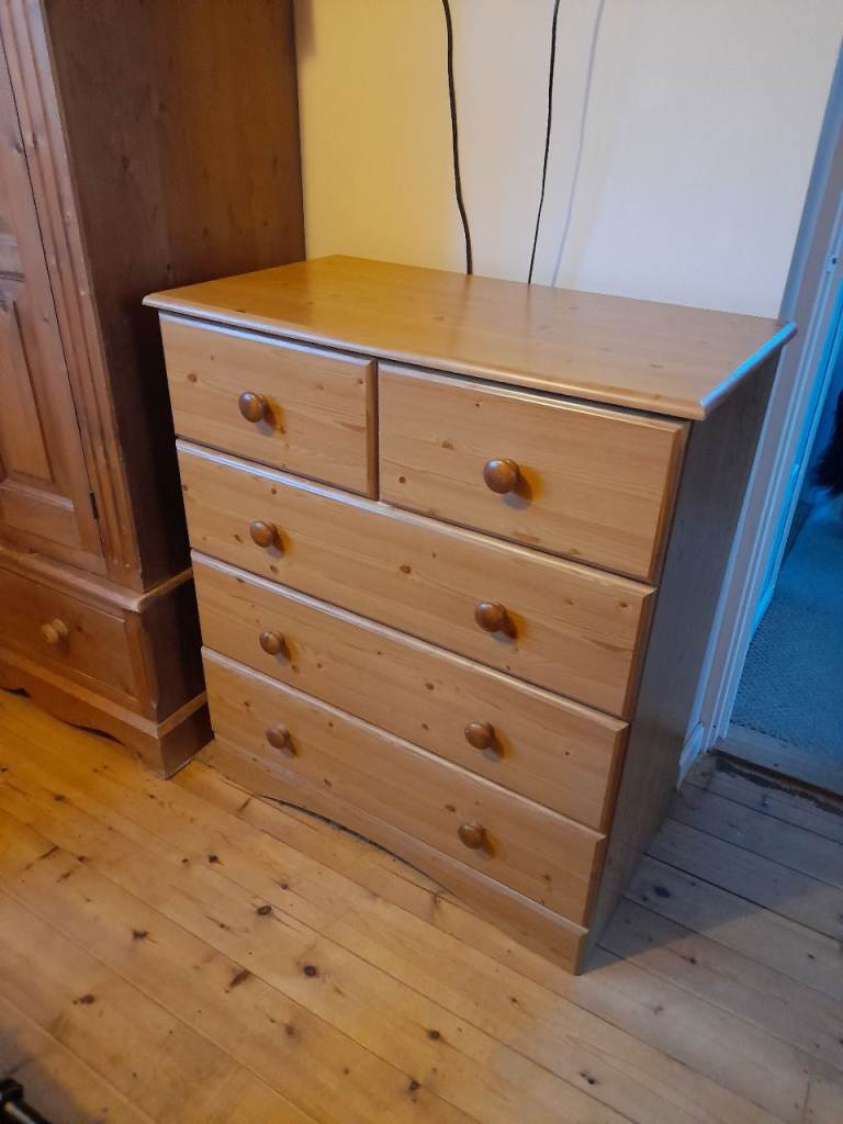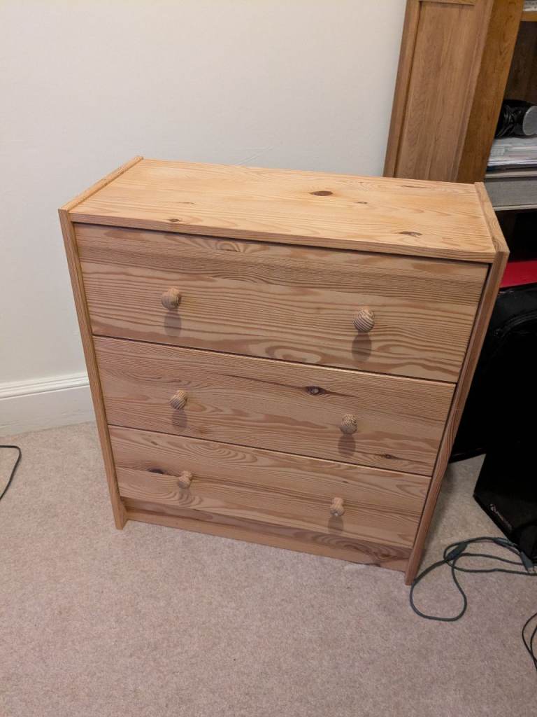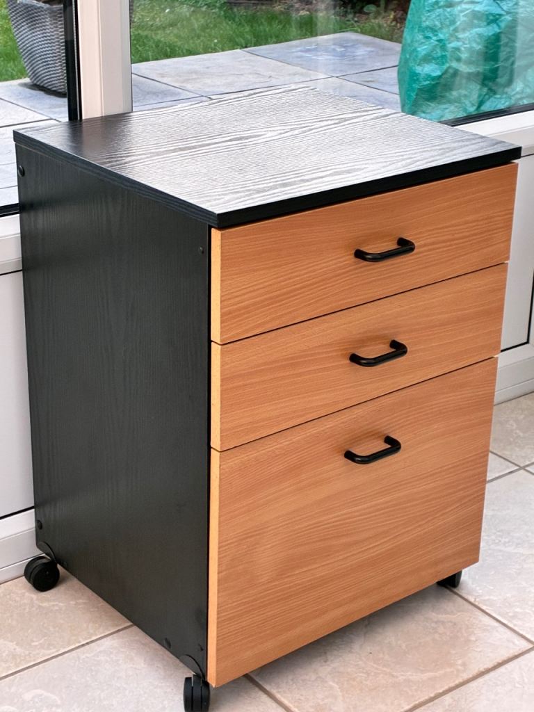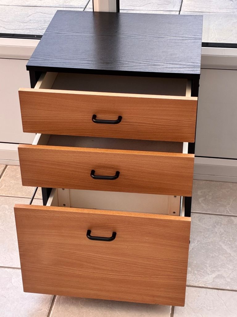 Drawers 3 drawers black base, wood drawers, black handles. On wheels.