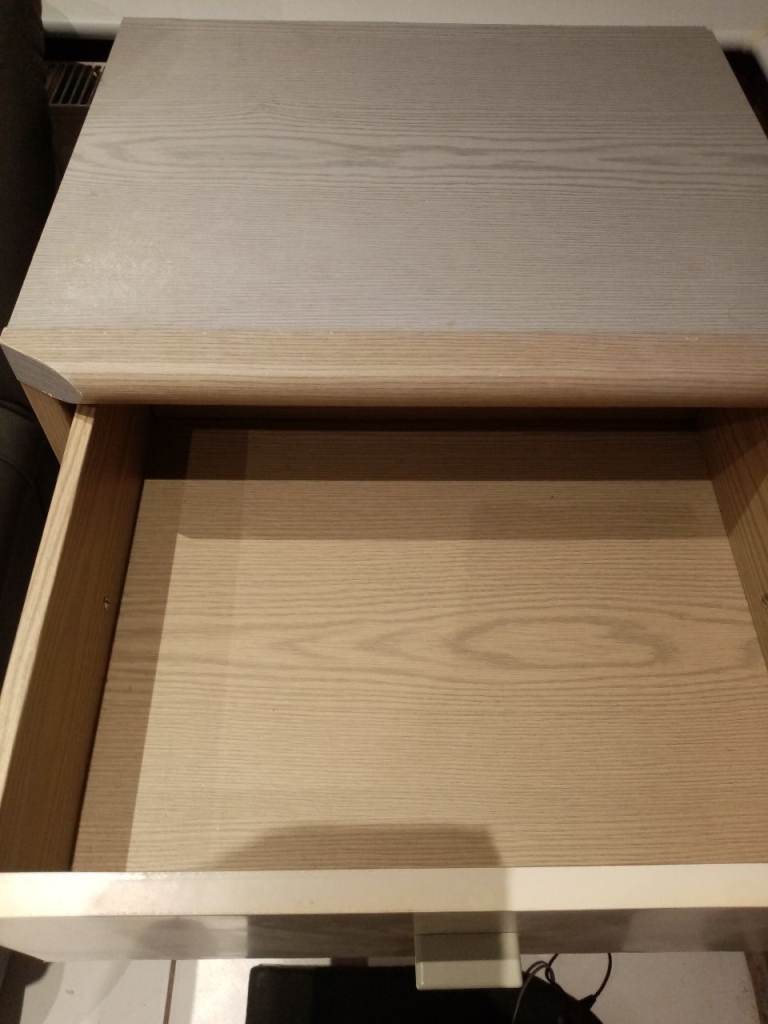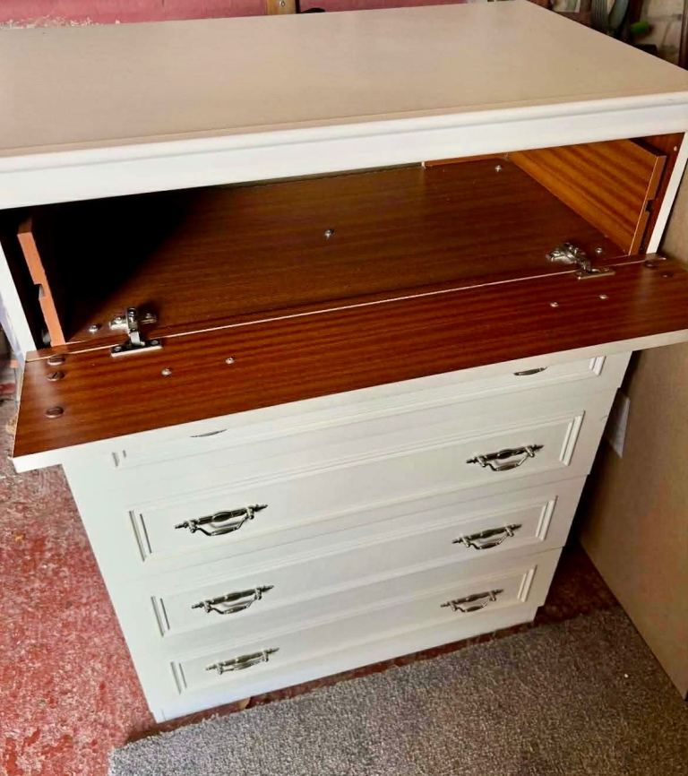 Good quality solid chest of drawers ..white with ornate handles ..top drawer drops down the others open as normal ..can deliver