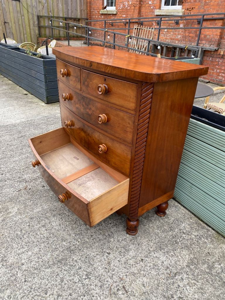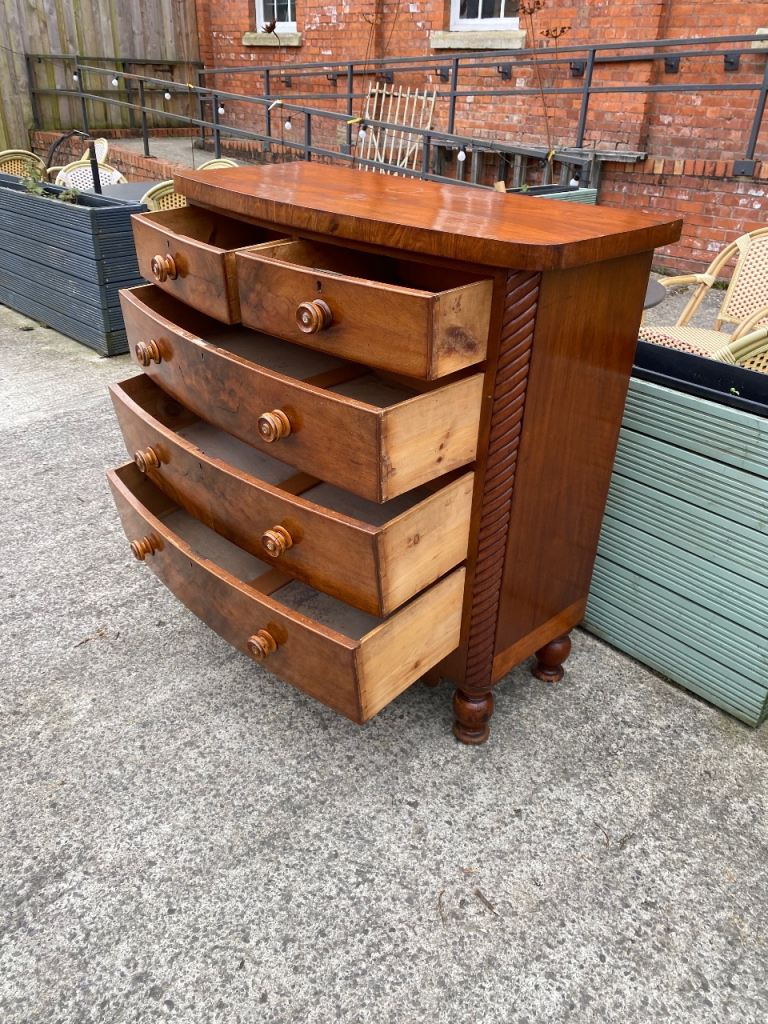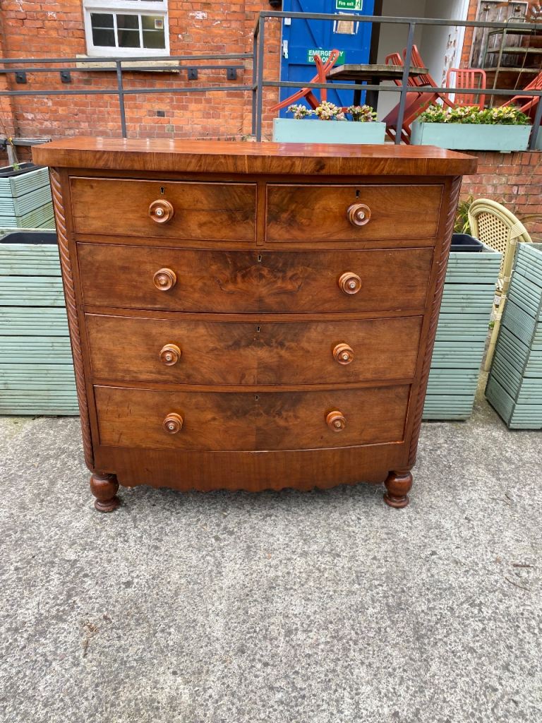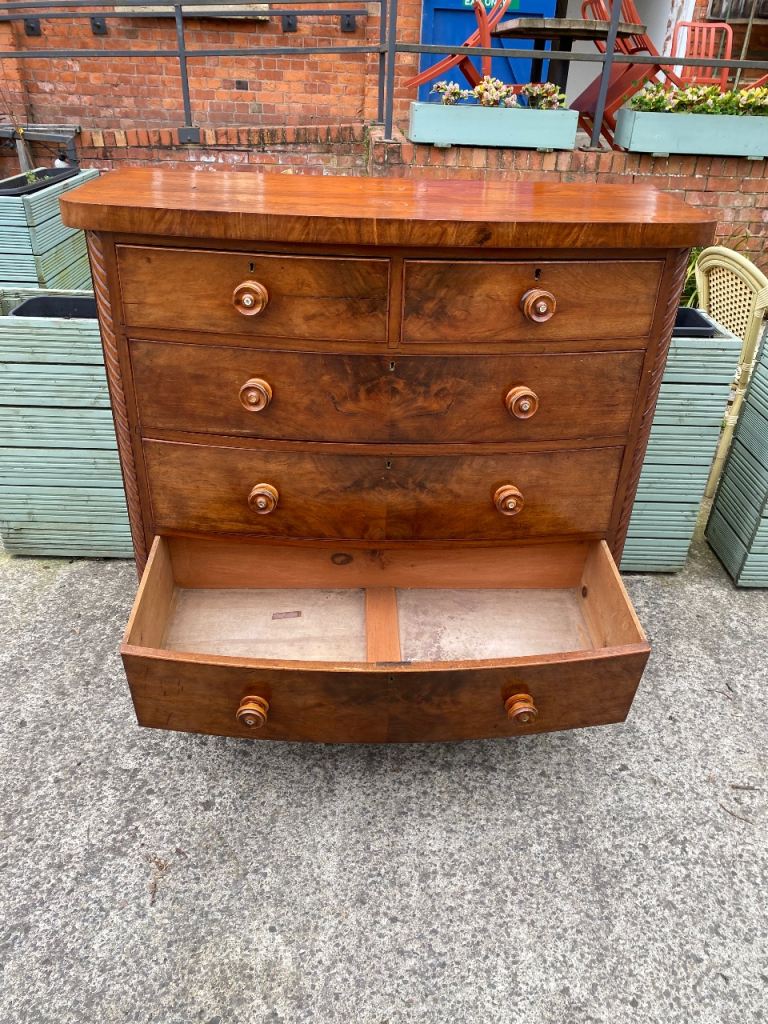 Large Bow Fronted Antique Flamed Mahogany Chest of Drawers still in perfect structural condition…all drawers made with hand made dovetails so really well made…all sliding still like new..they were lined with paper which o took out so their all spotless inside..all with their original decorative wooden handles….in great condition for its age.