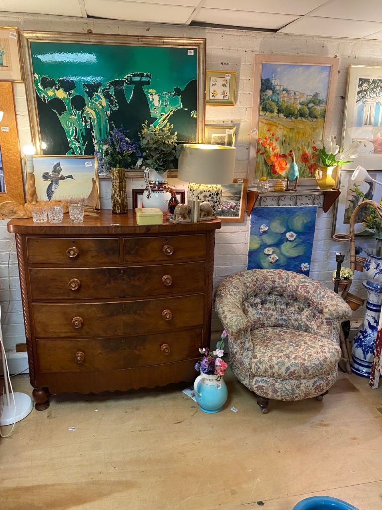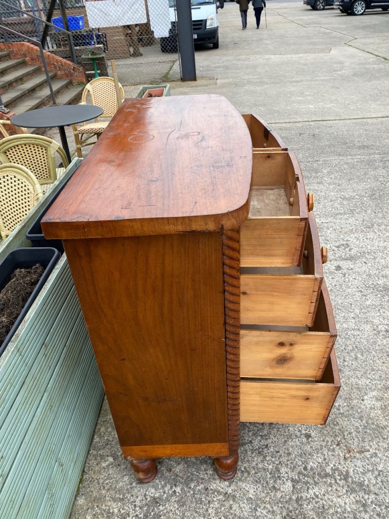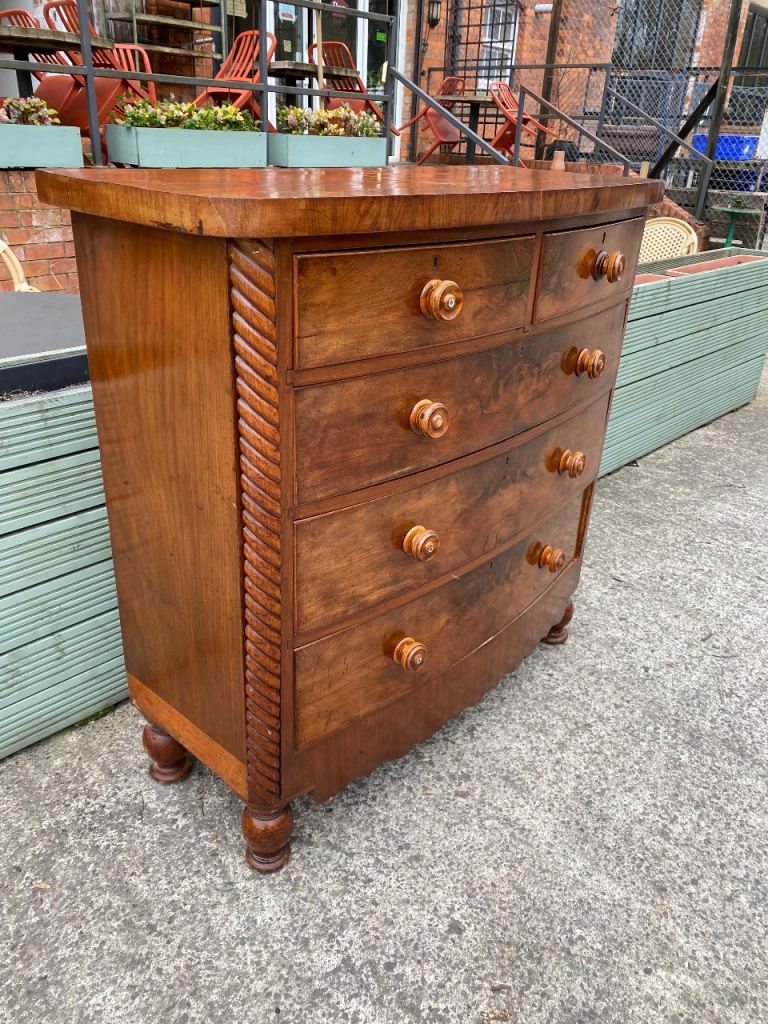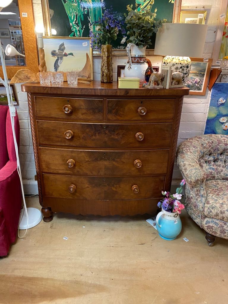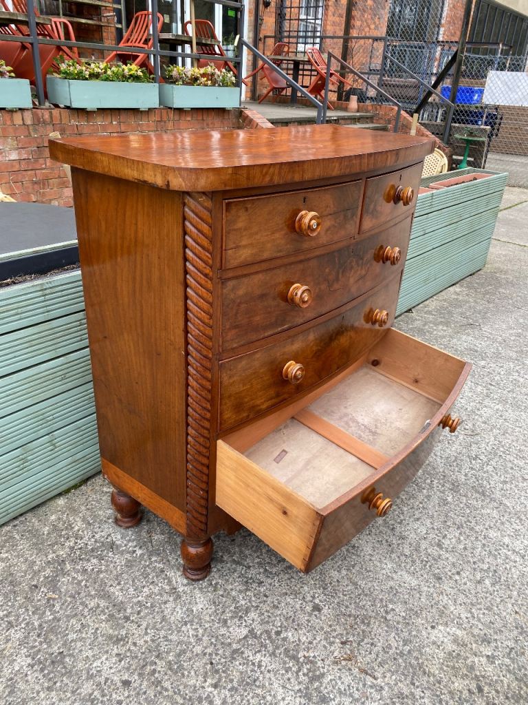 Large Bow Fronted Antique Flamed Mahogany Chest of Drawers still in perfect structural condition…all drawers made with hand made dovetails so really well made…all sliding still like new..they were lined with paper which o took out so their all spotless inside..all with their original decorative wooden handles….in great condition for its age.