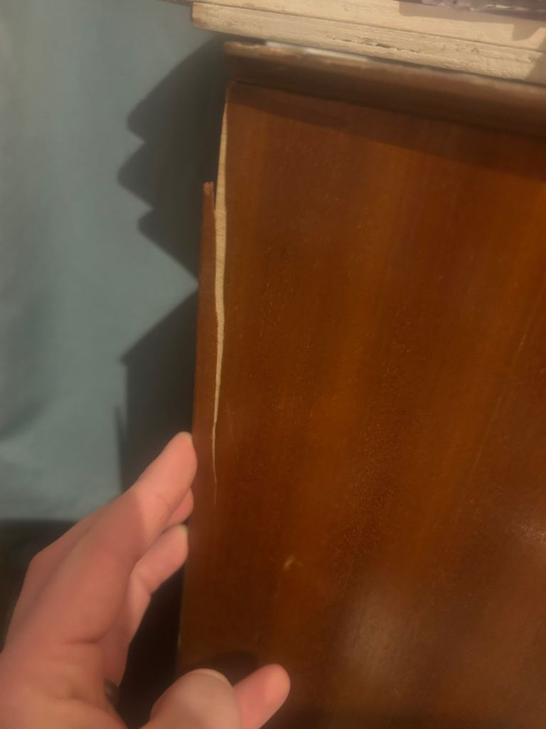 Large 5 drawer, ornate style, teak veneer, heavy weight, some minor damage to the side as shown in picture. Solid old school type.