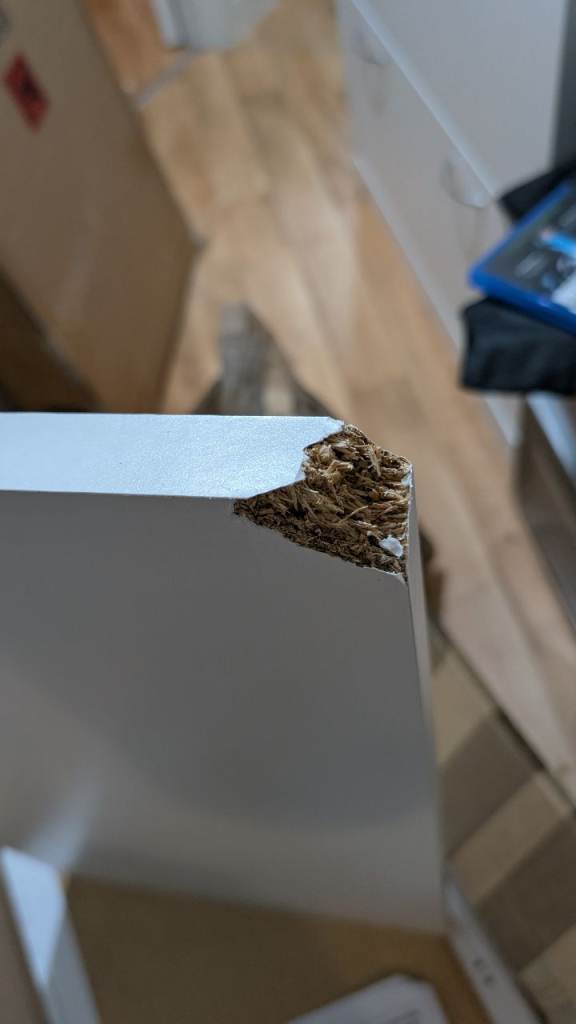 This item is new, but there is small damage to the edge of the chest. See images
