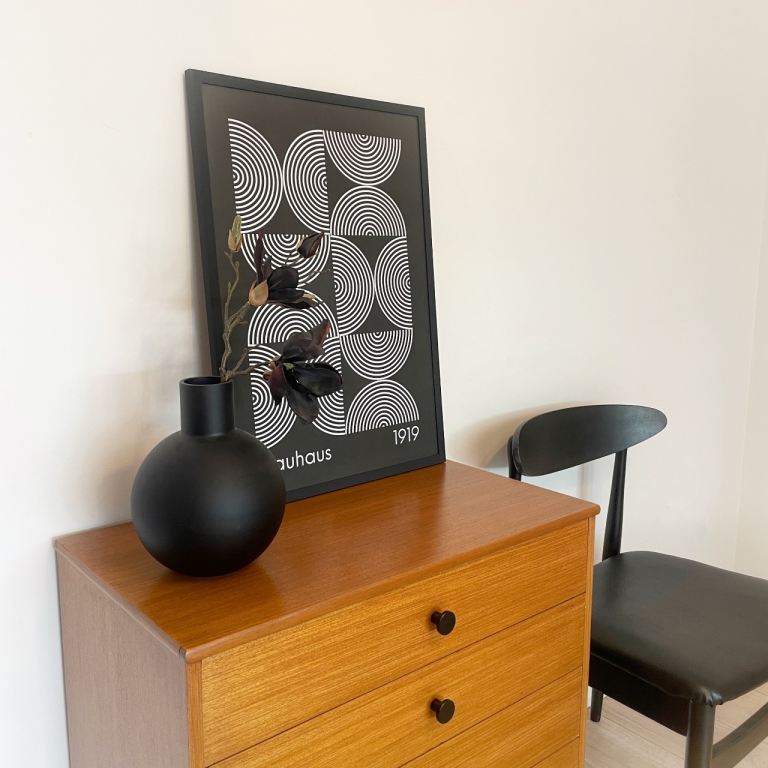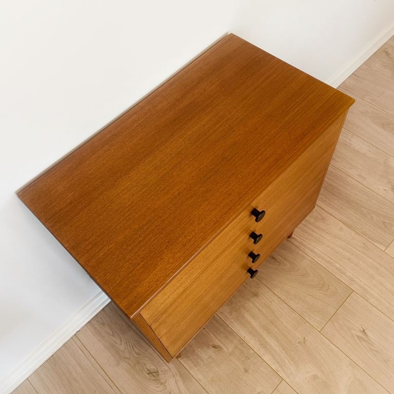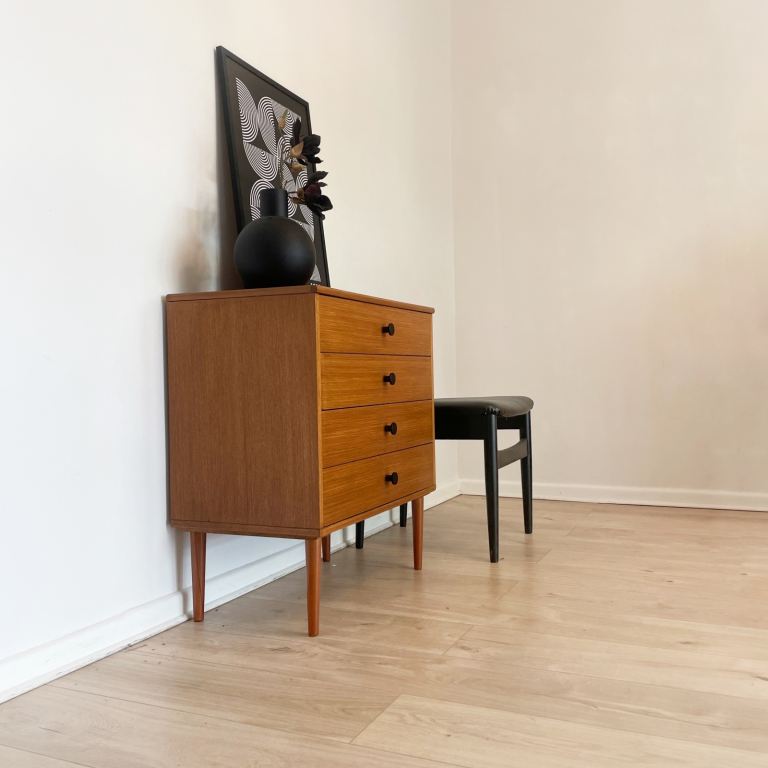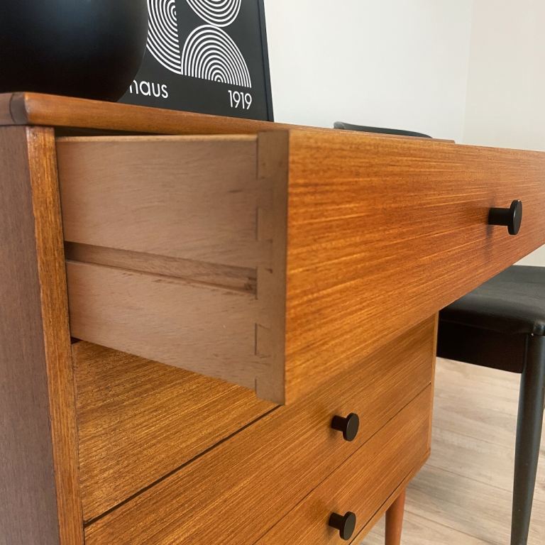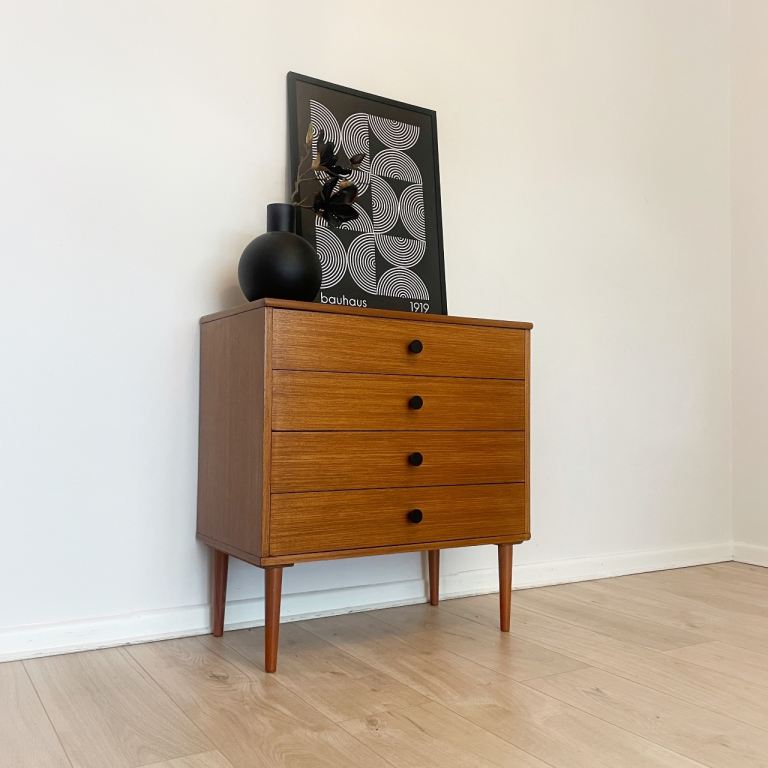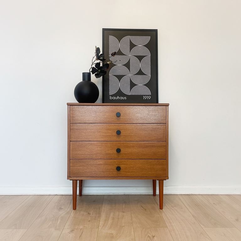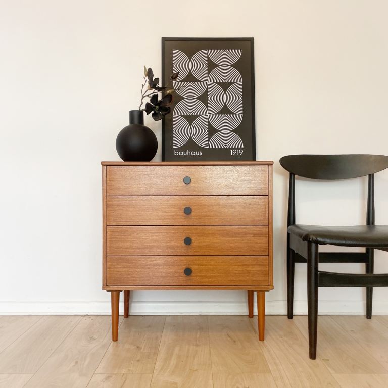 The whole chest of drawers has been refinished, and varnished for protection. The four drawers have been lined with complementary paper, and new black knobs have been added.