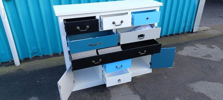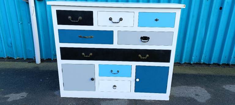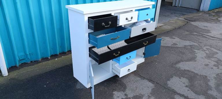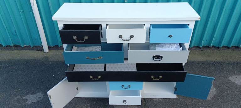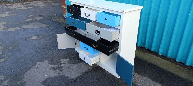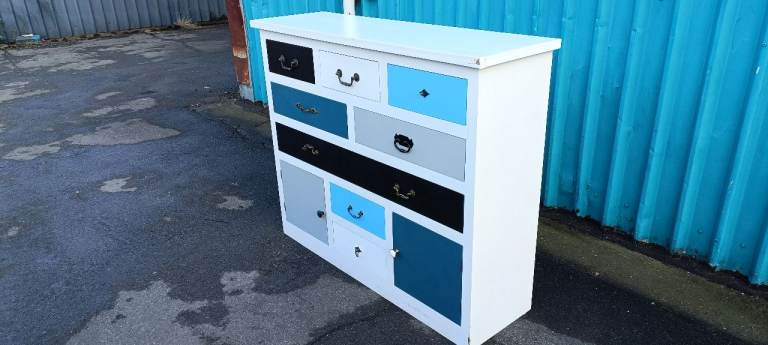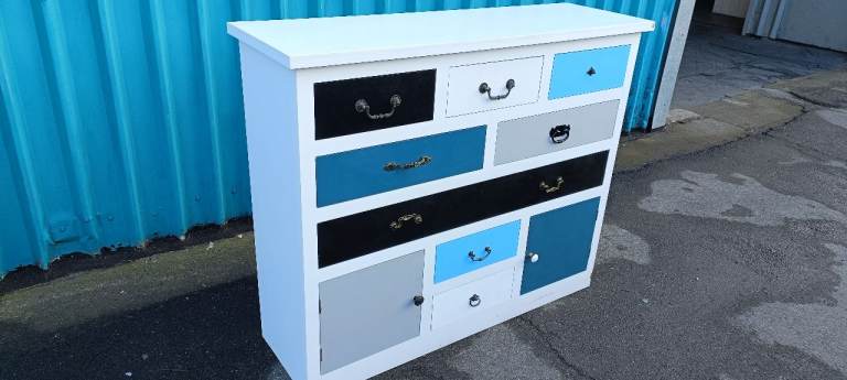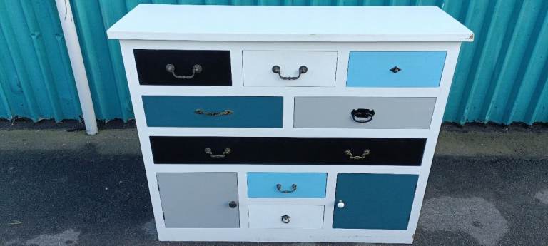 For sale a good quality modern and stylish multicoloured Eight drawer chest with Two lower storage cupboards, a few minor age related marks and one handle missing from upper right drawer but overall in good clean condition from a smoke and pet free home.