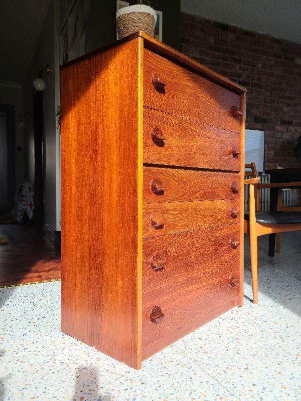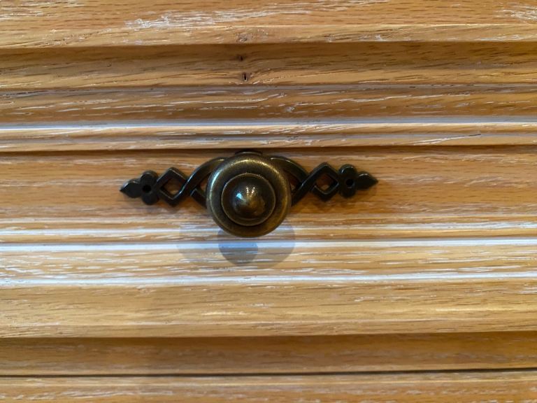 Very good vintage condition overall – drawers open and close smoothly with no sticking, no structural issues, no veneer damage or cracks. Only light surface patina and usage marks (typical for natural oak furniture of this age – see photos), lacquer remains glossy and protective. Presents very well and requires no restoration.