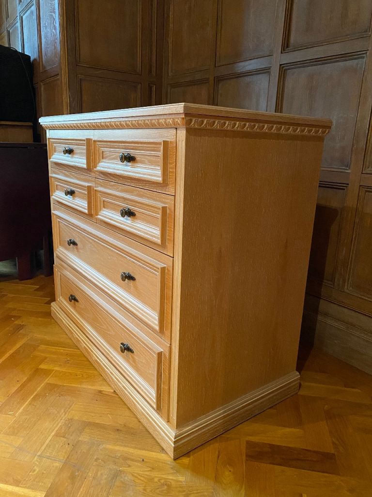 Beautiful light oak 6-drawer chest in classic English traditional style (Georgian revival reproduction). Solid oak or high-quality oak veneer with warm honey tones, profiled drawer fronts, decorative carved top moulding and antique-style brass ball-knob handles.