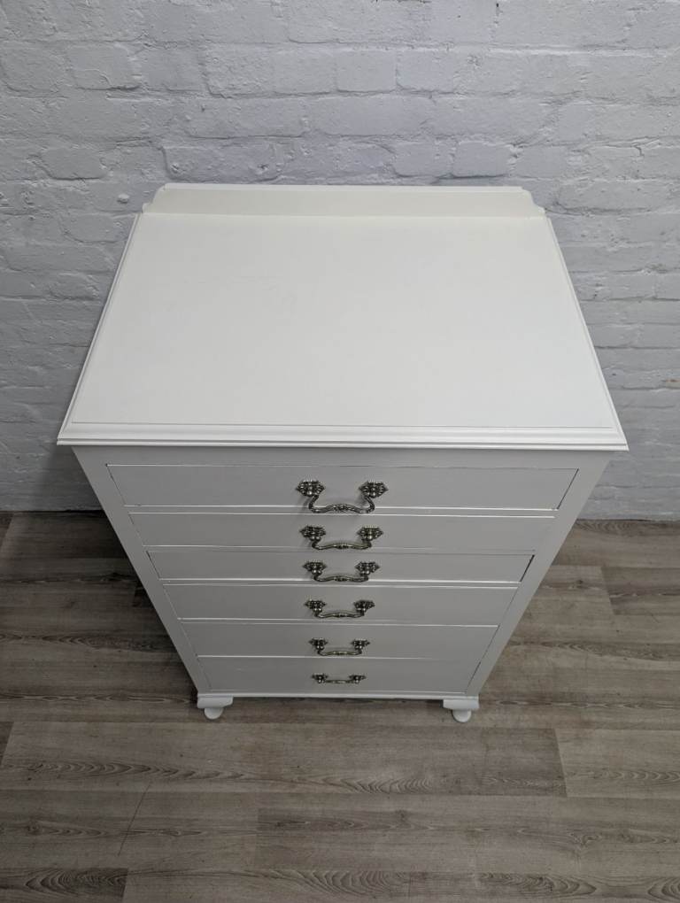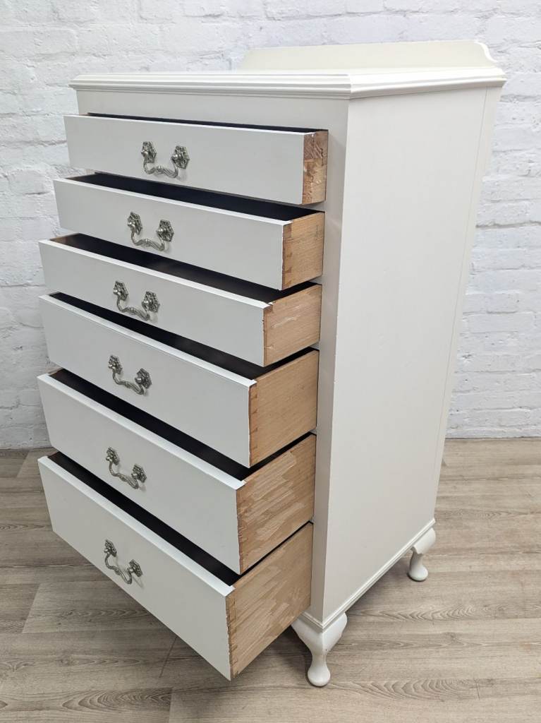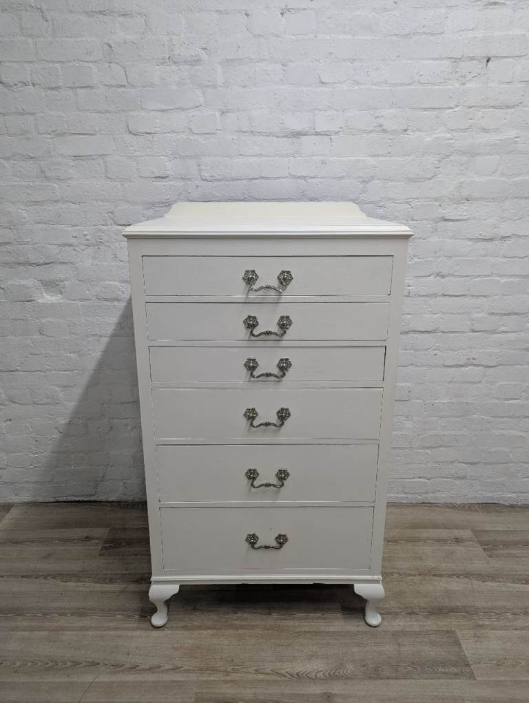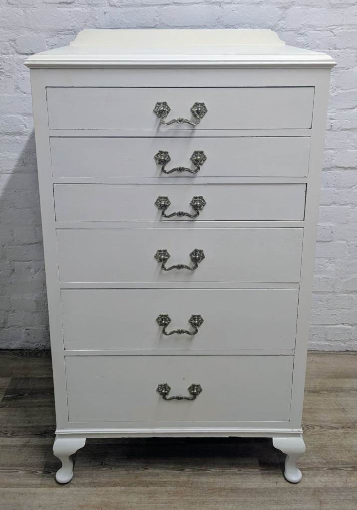 Queen Anne style 6 drawer tallboy chest of drawers. Early 20th century with a freshly painted white finish and new handles.